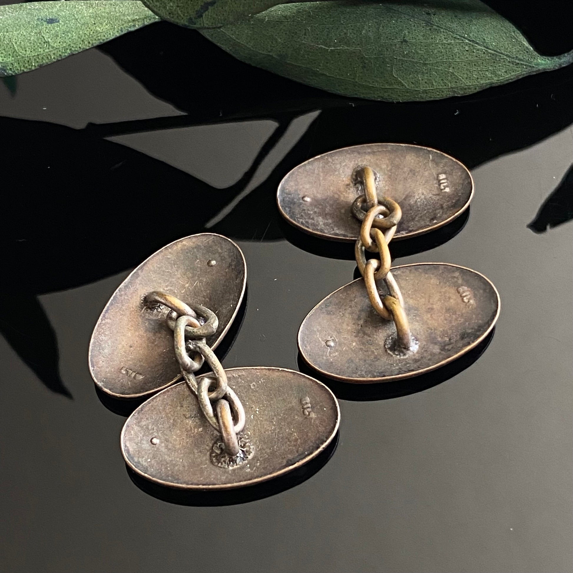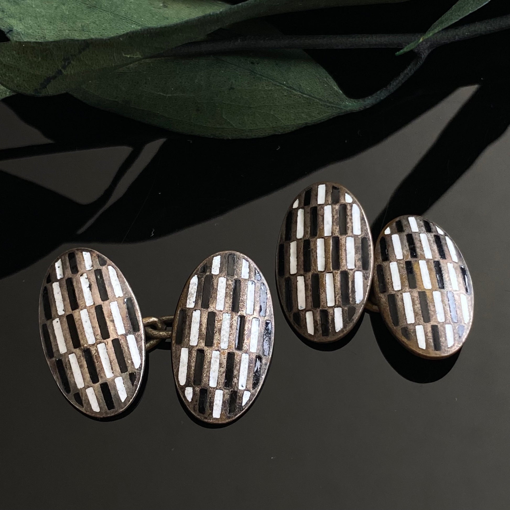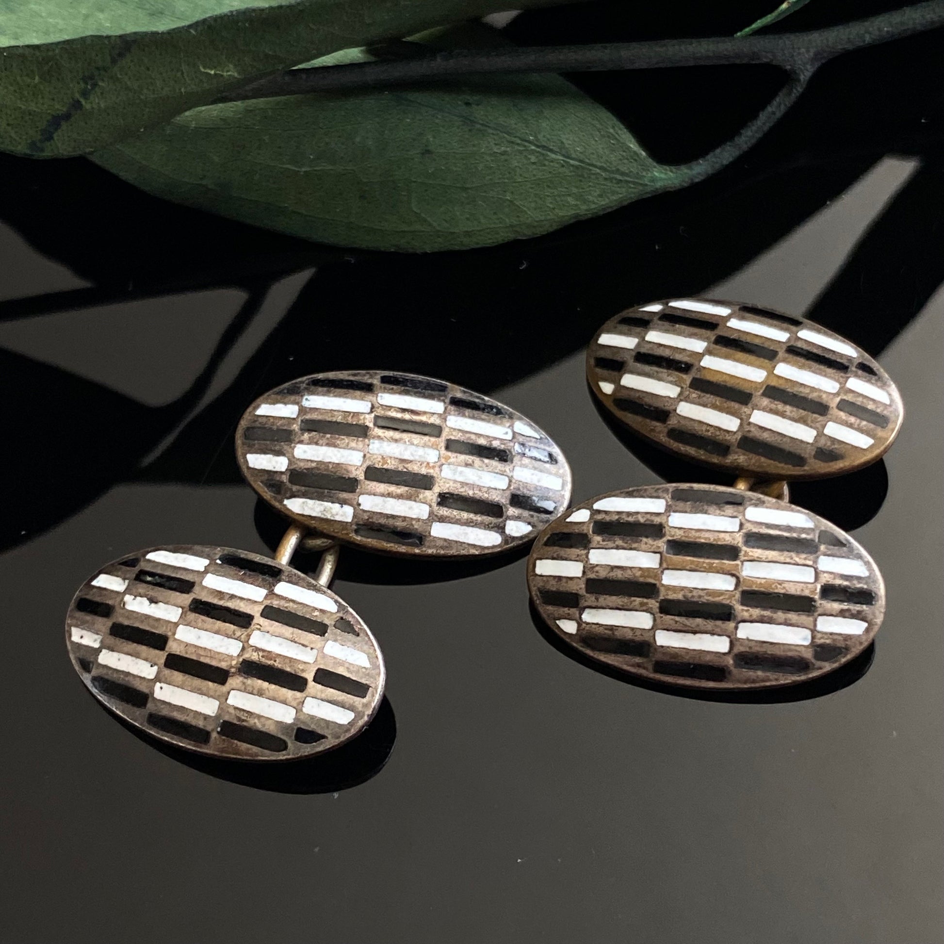 Antique silver plated brass black and white enamel checkerboard oval cufflinks. There is an embossed stamp on the backside of each that appears to read "GILT".