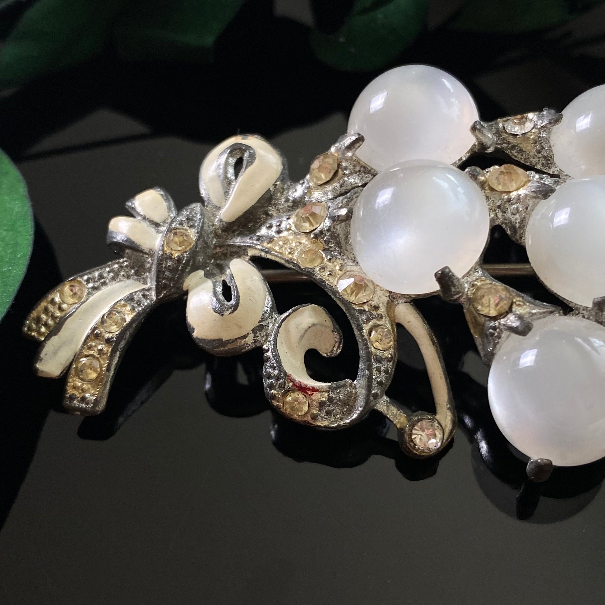Vintage retro era circa 1940s pot metal bouquet brooch with white enameling, clear rhinestones, and white lucite moonglow cabochons.
