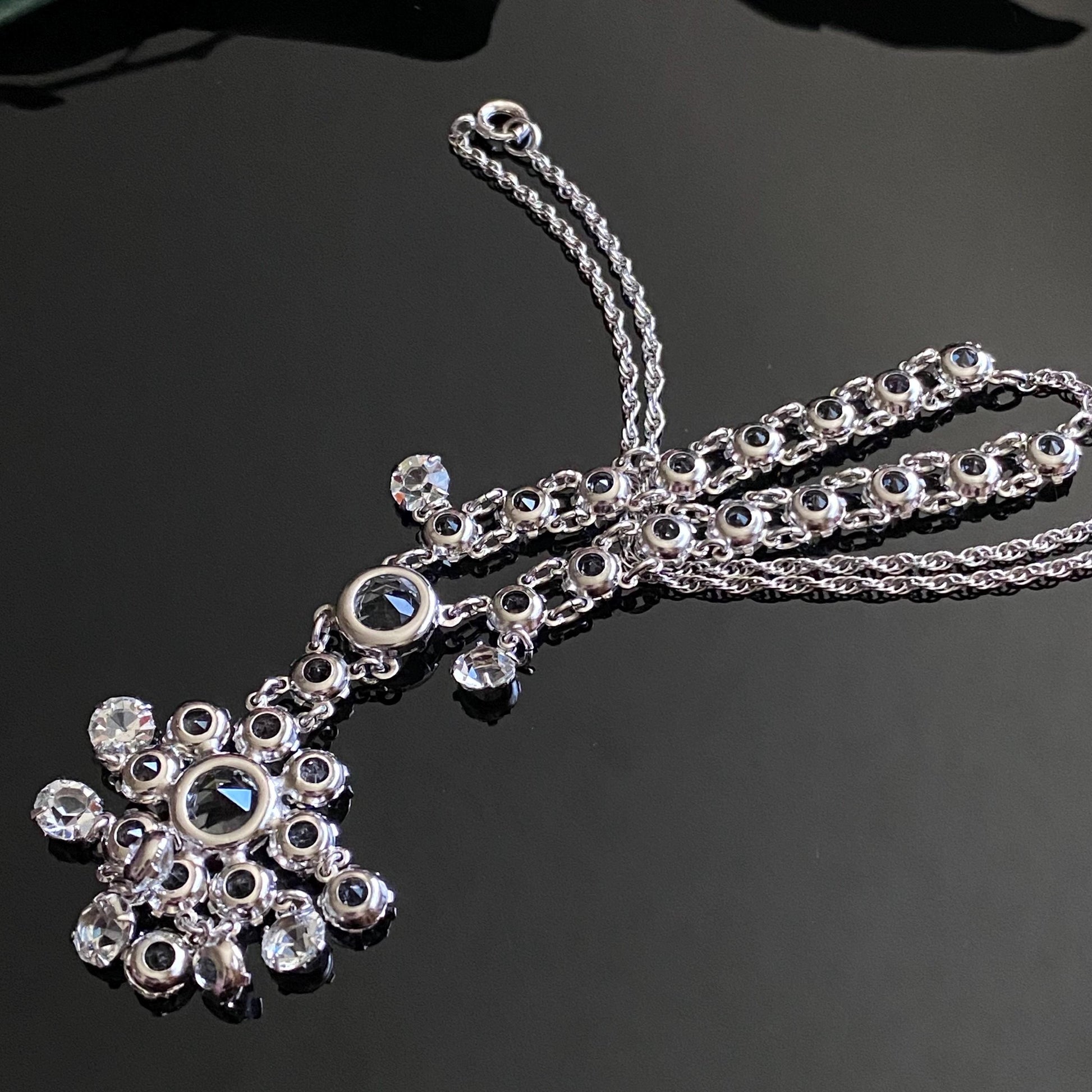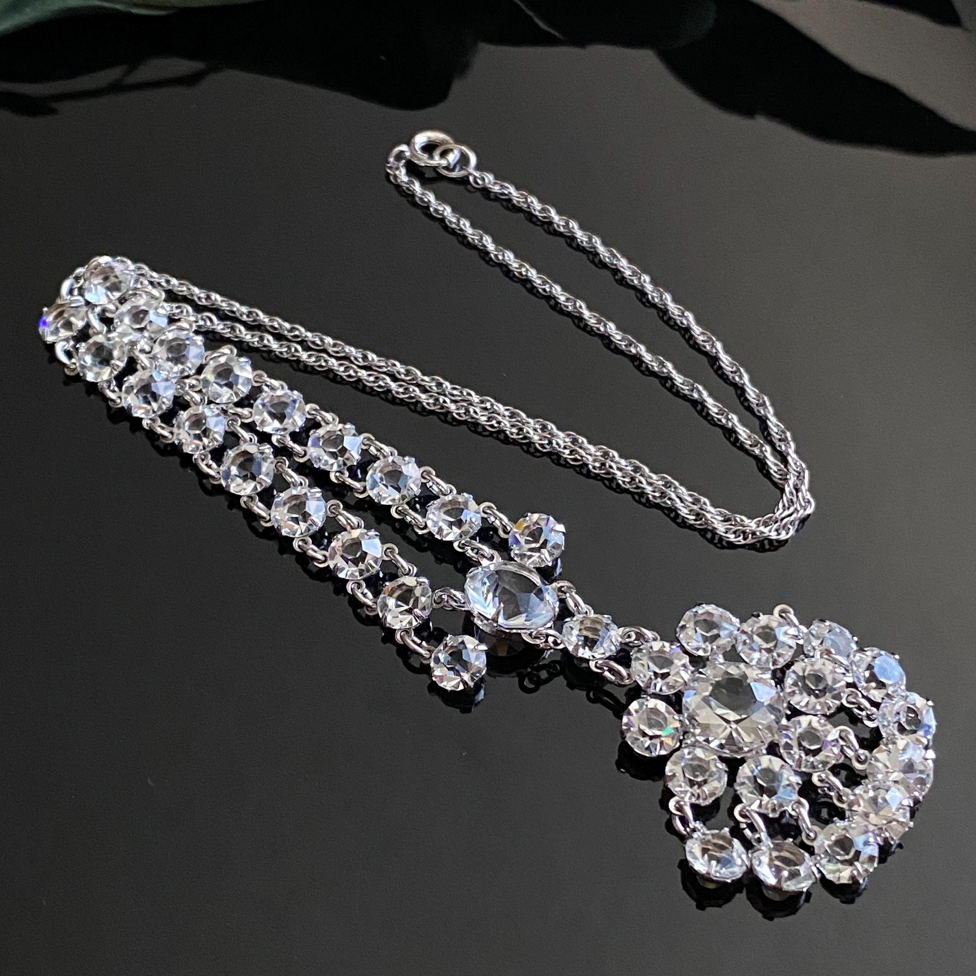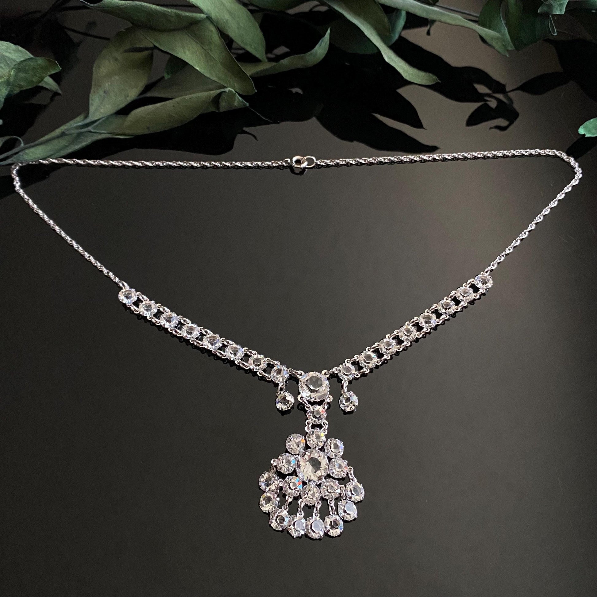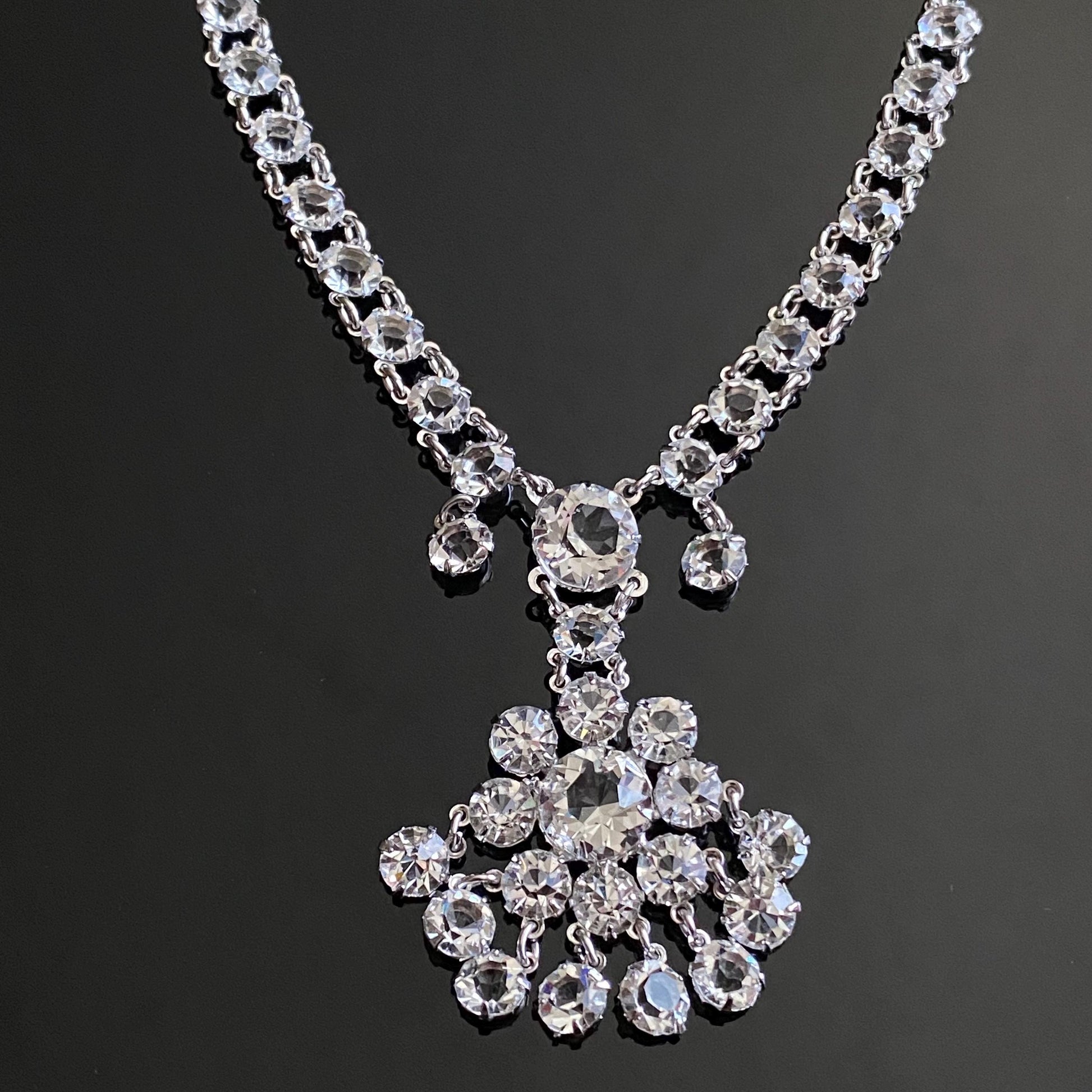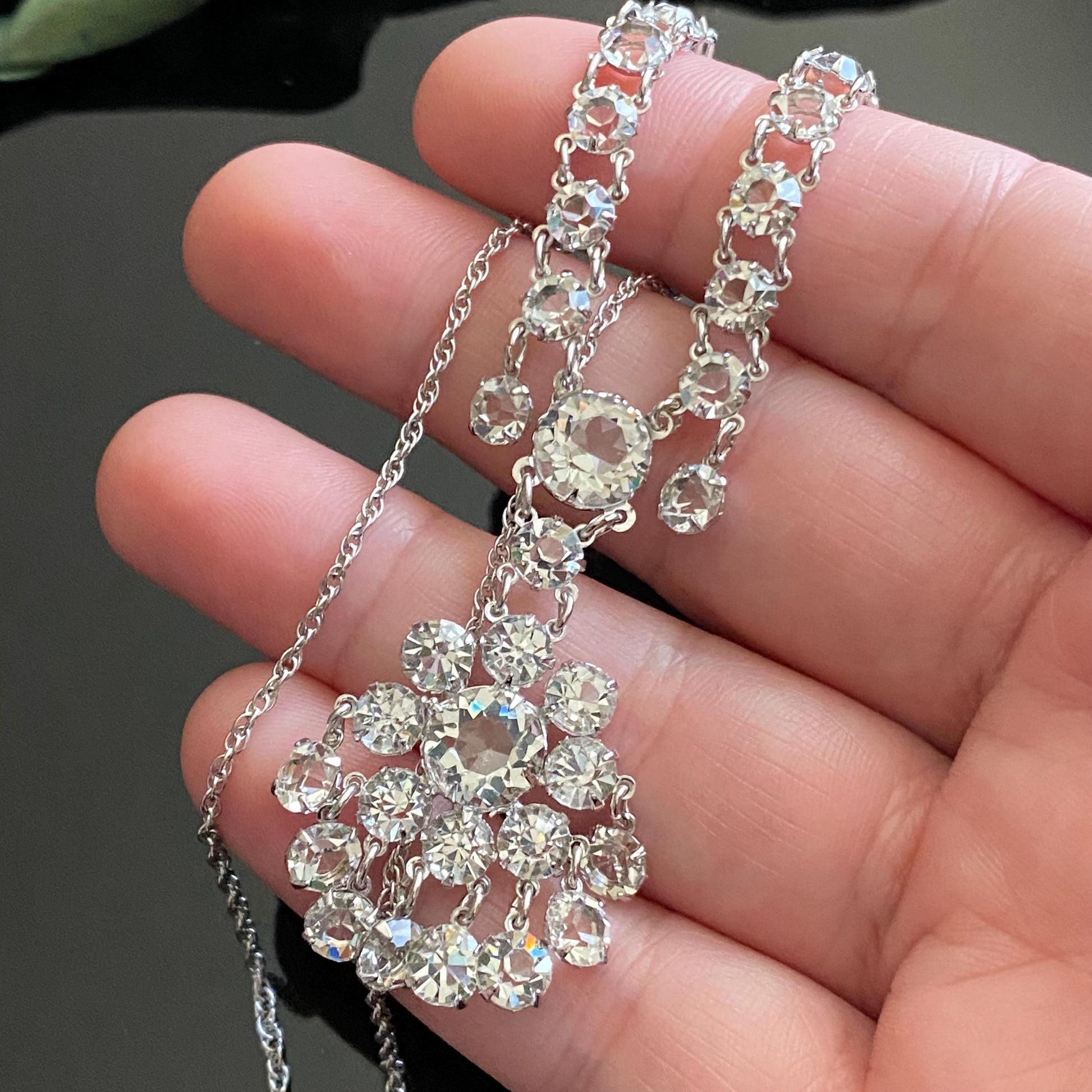 Vintage art deco to retro era necklace 1/20th 12k white gold filled open back round cut glass paste necklace with flower drop.