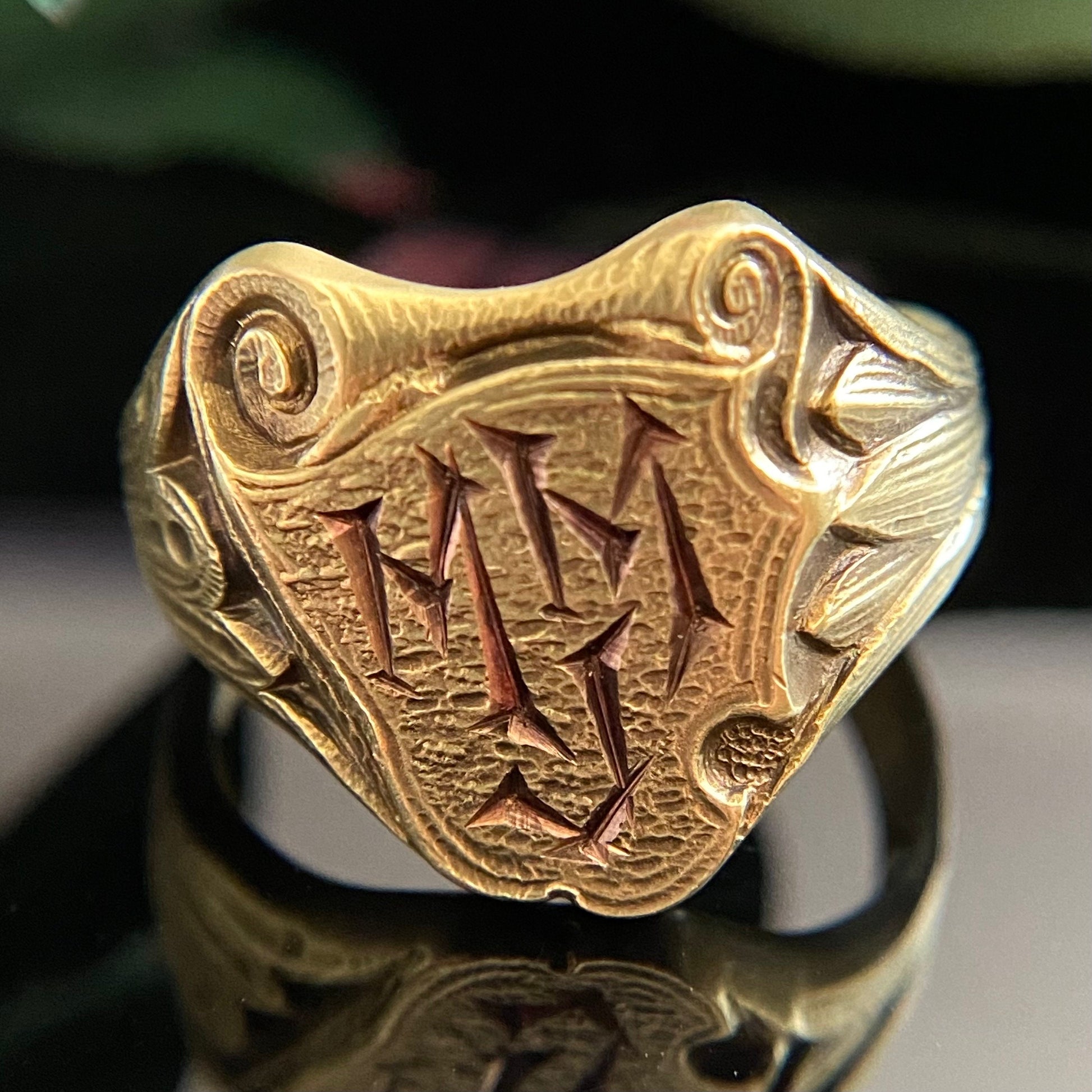 Antique 10k Gold Art Nouveau Mens Engraved Scroll Signet Ring | Size 11 | Monogram MMJ