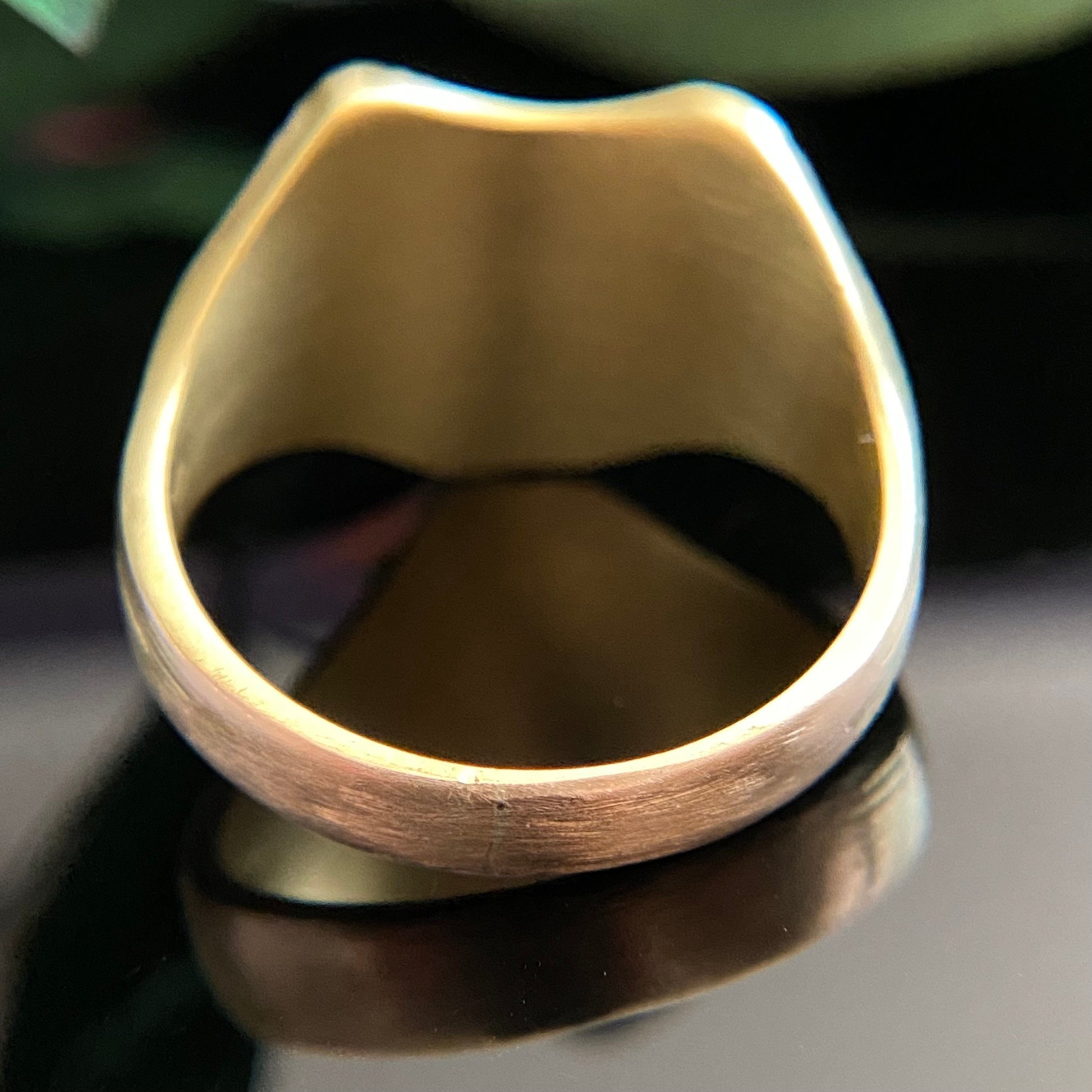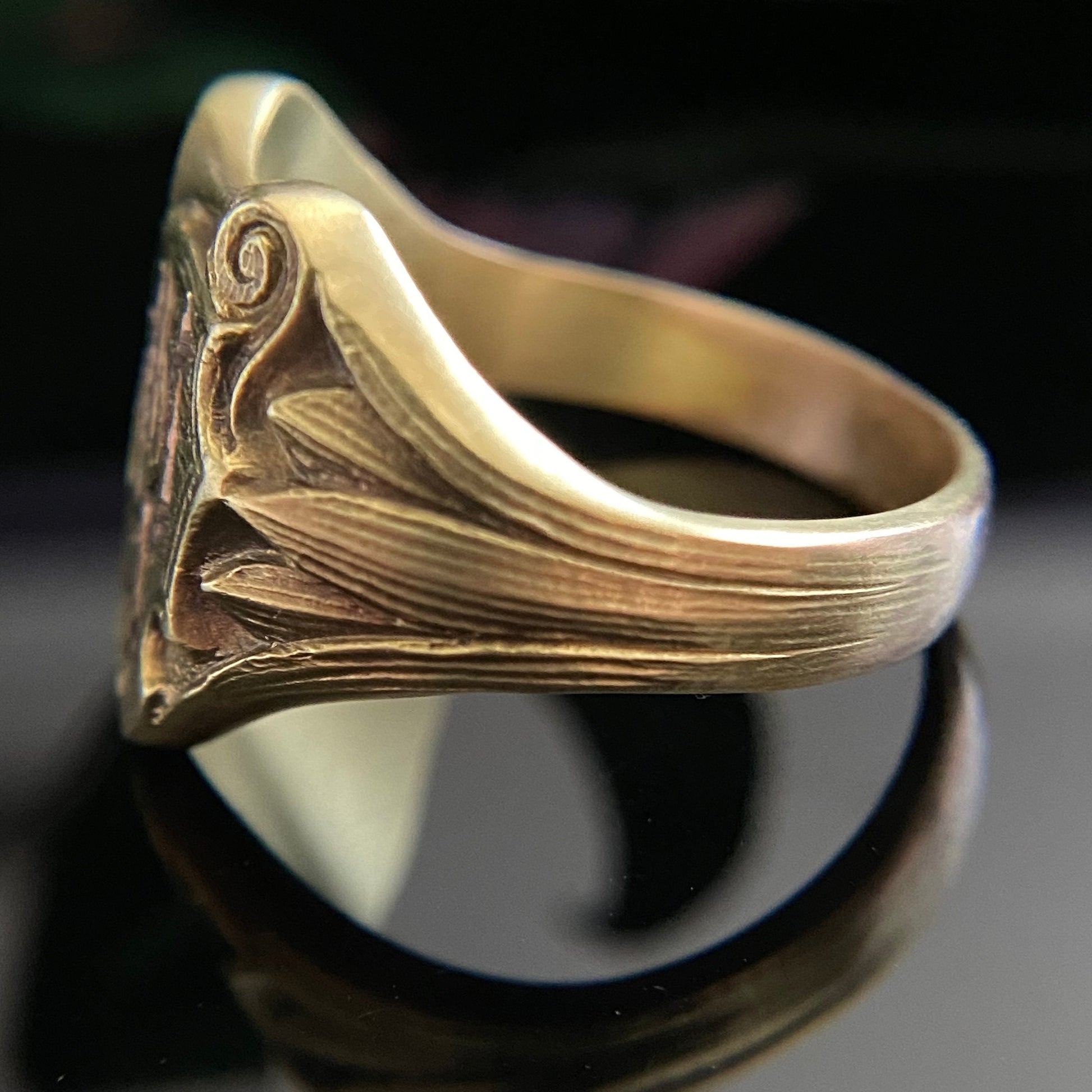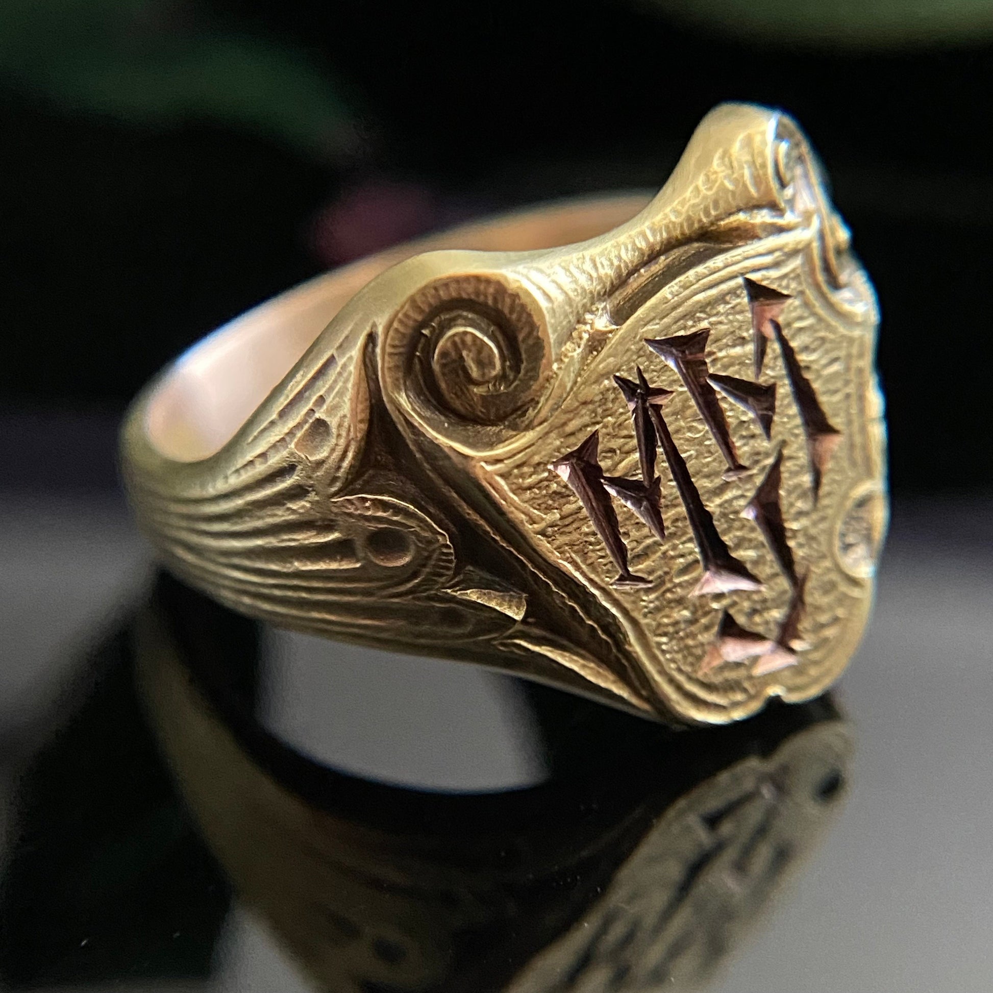 Antique art nouveau heavy 10k gold men’s scroll signet ring with the initials MMJ engraved on the face. The ring appears to be rose gold with a brushed greenish yellow gold matte finish.