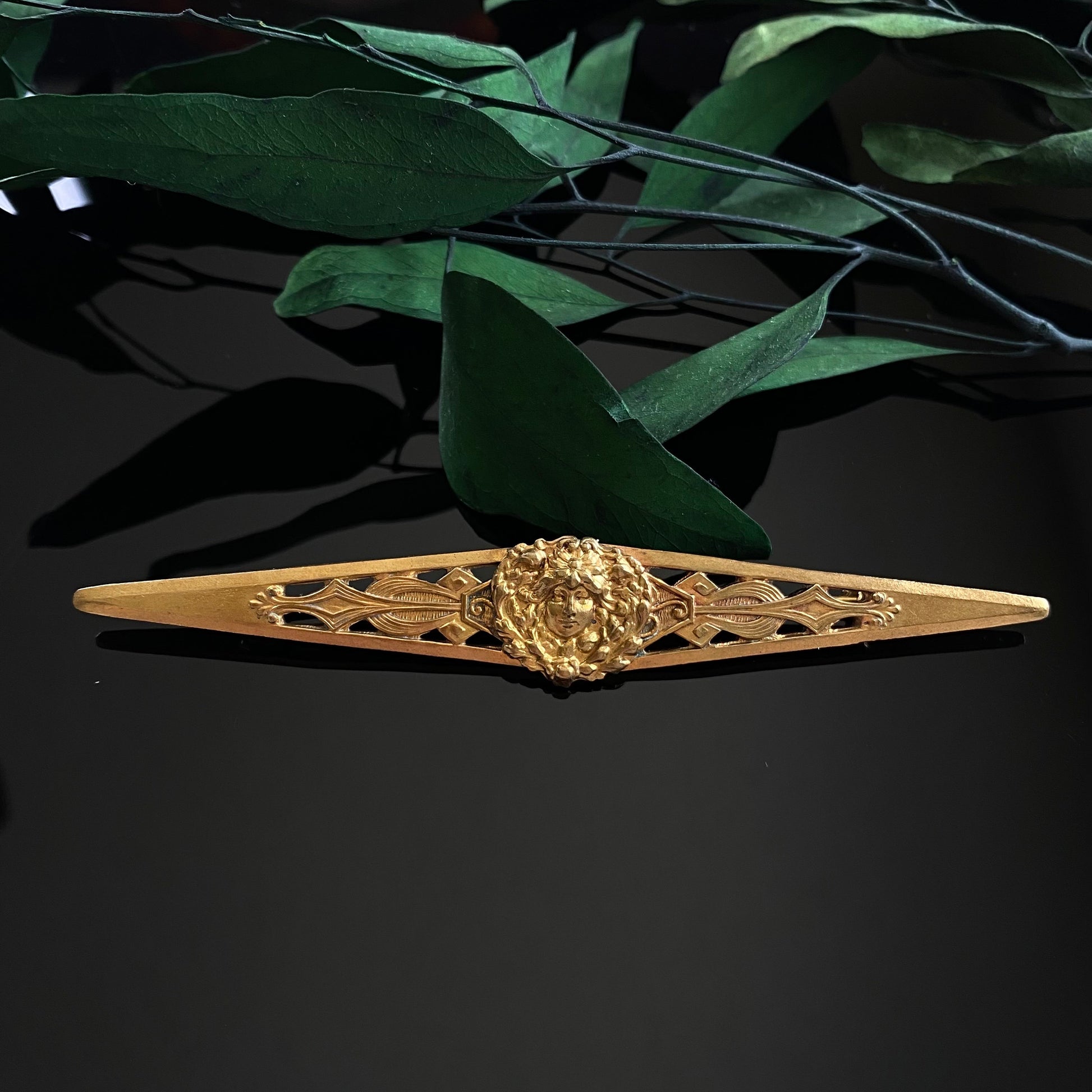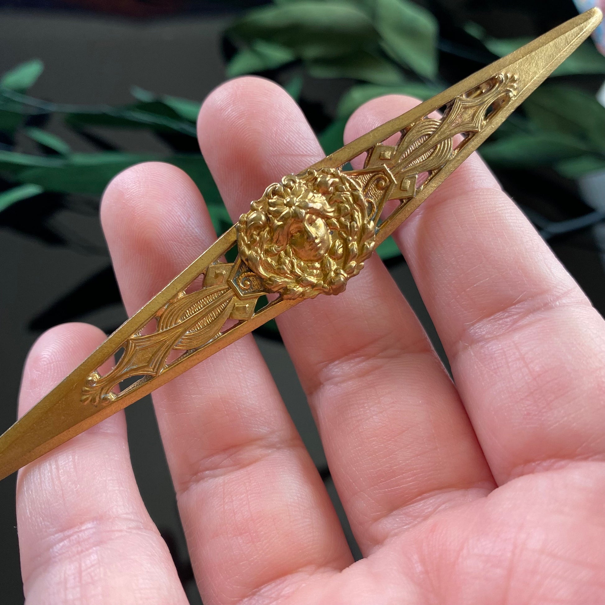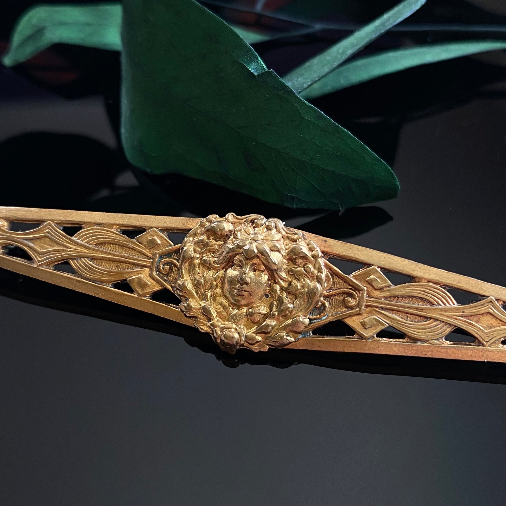 Antique art nouveau flower maiden extra long brass bar pin. Good condition with the exception of a bit of verdigris behind the center ornament. Measures 4.25” long. Perfect for cloaks, shawls, and capes.