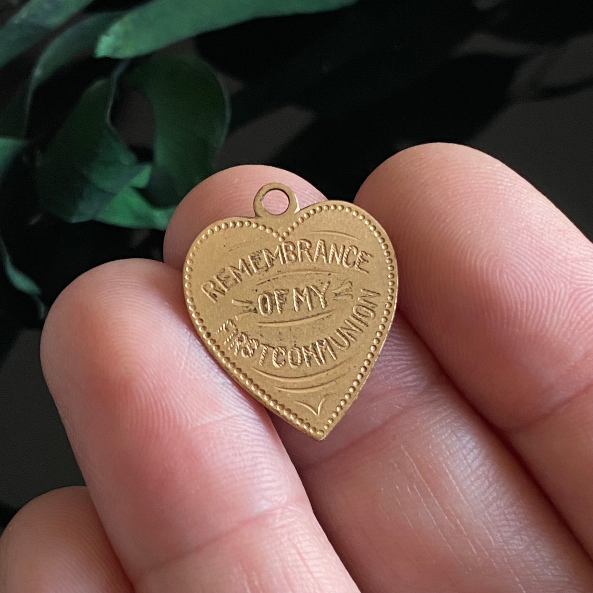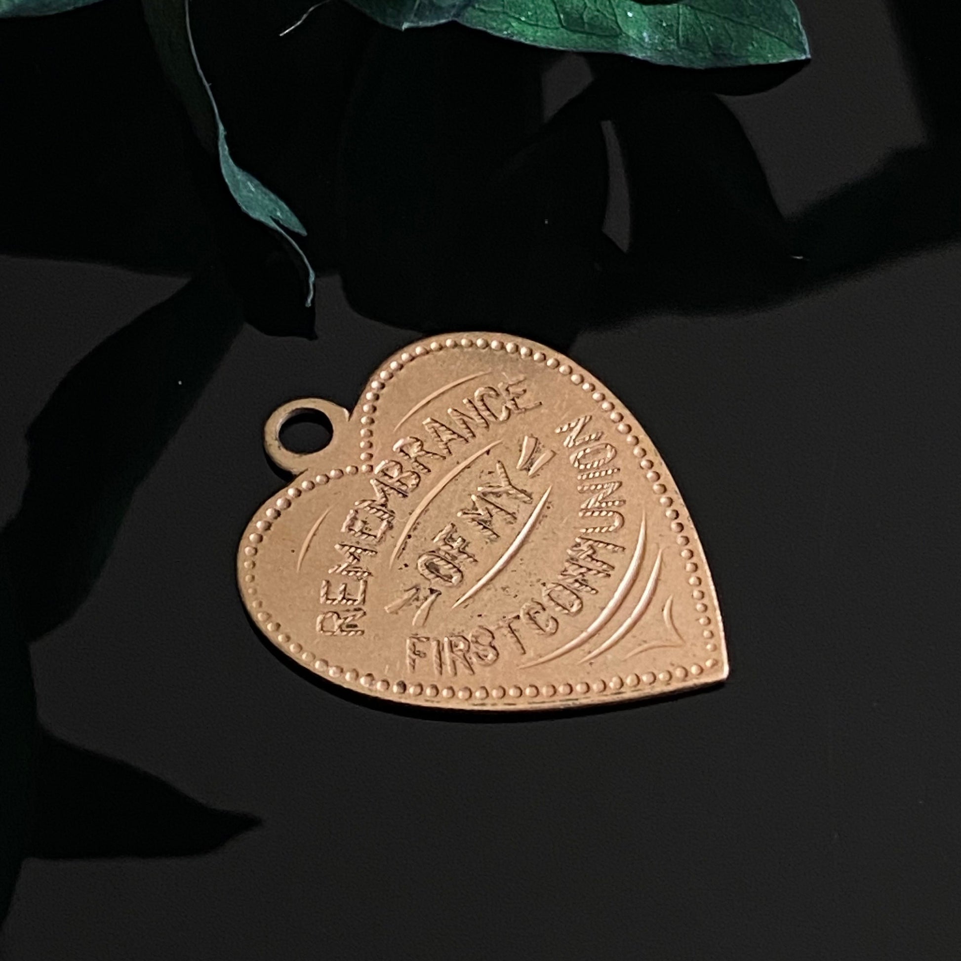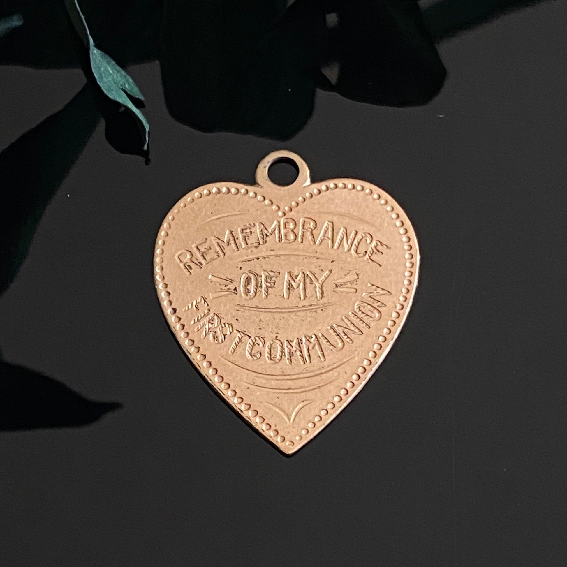 Antique gold filled heart charm with "Remembrance of my First Communion" engraved on the front.