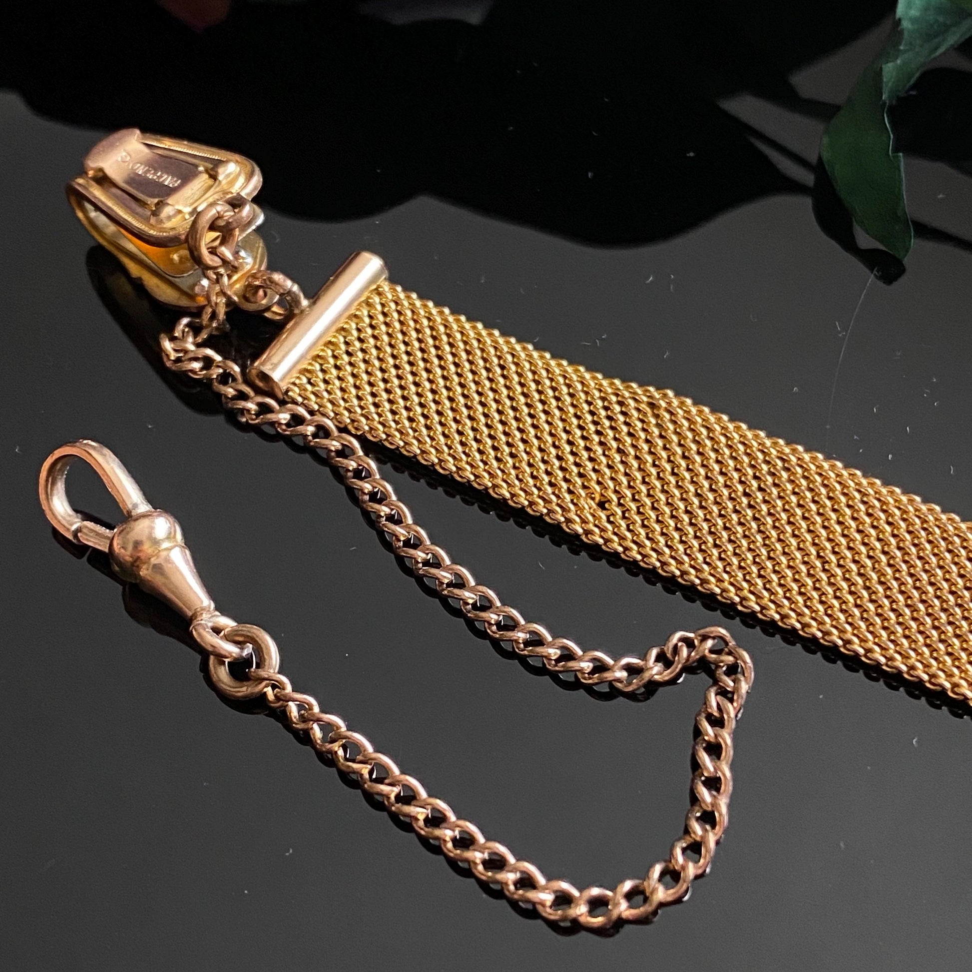 Antique gold filled mesh fob watch chain with vest clip and non-swivel dog clip. Marked "pat.(ent) pend'g" on vest clip and "10 year" on dog clip.