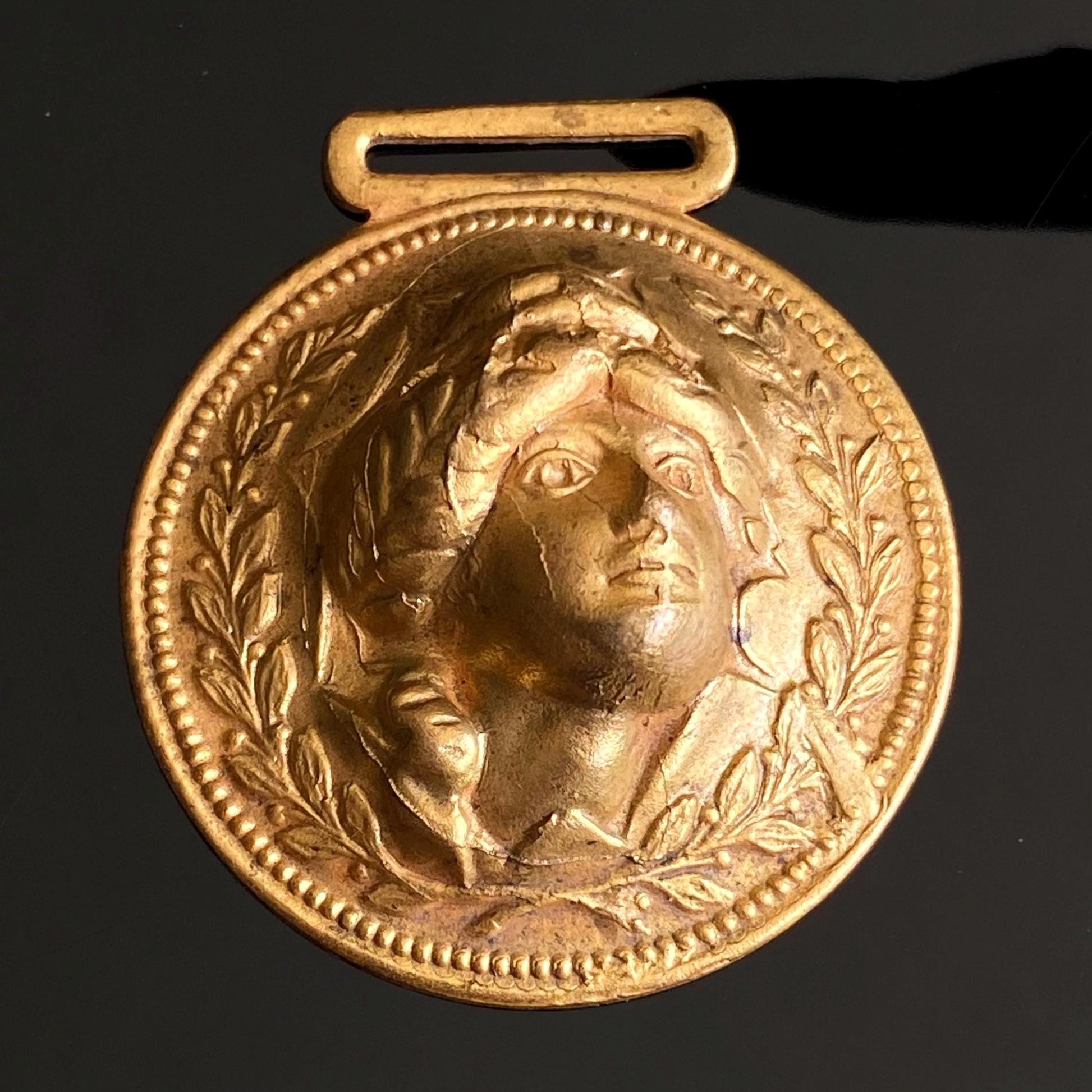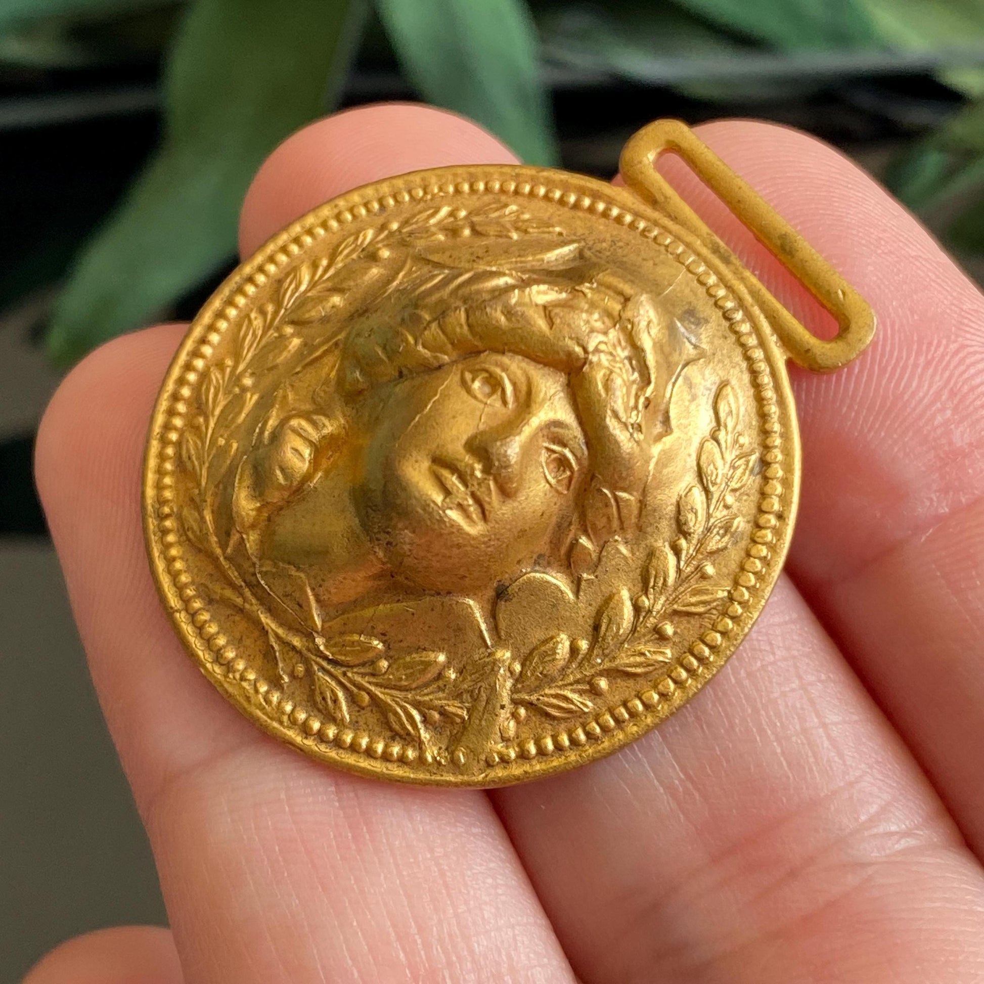 Antique art nouveau gilt brass repousse Gibson Girl charm for leather or ribbon fob.
