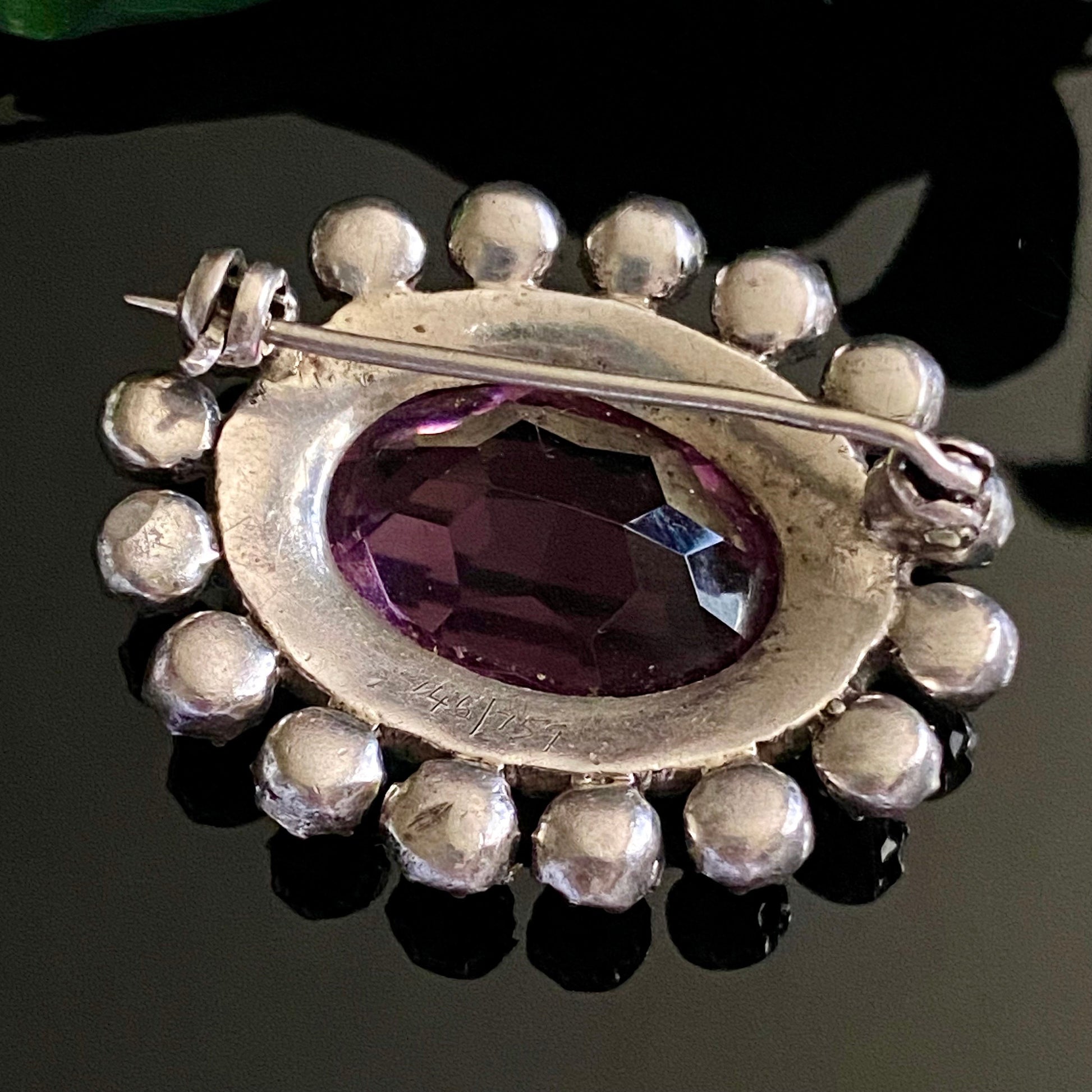 Exquisite antique Edwardian to Art Deco era silver brooch with an oval amethyst colored glass paste surrounded by a double halo of clear round cut pastes. Though difficult to capture in photographs, the brooch is very sparkly and in many ways could pass as fine jewelry to an untrained eye. There is a hand engraved "146/759" that is some sort of jeweler's marking on the back. The brooch, including the rolling safety catch, appears to have been hand fabricated.