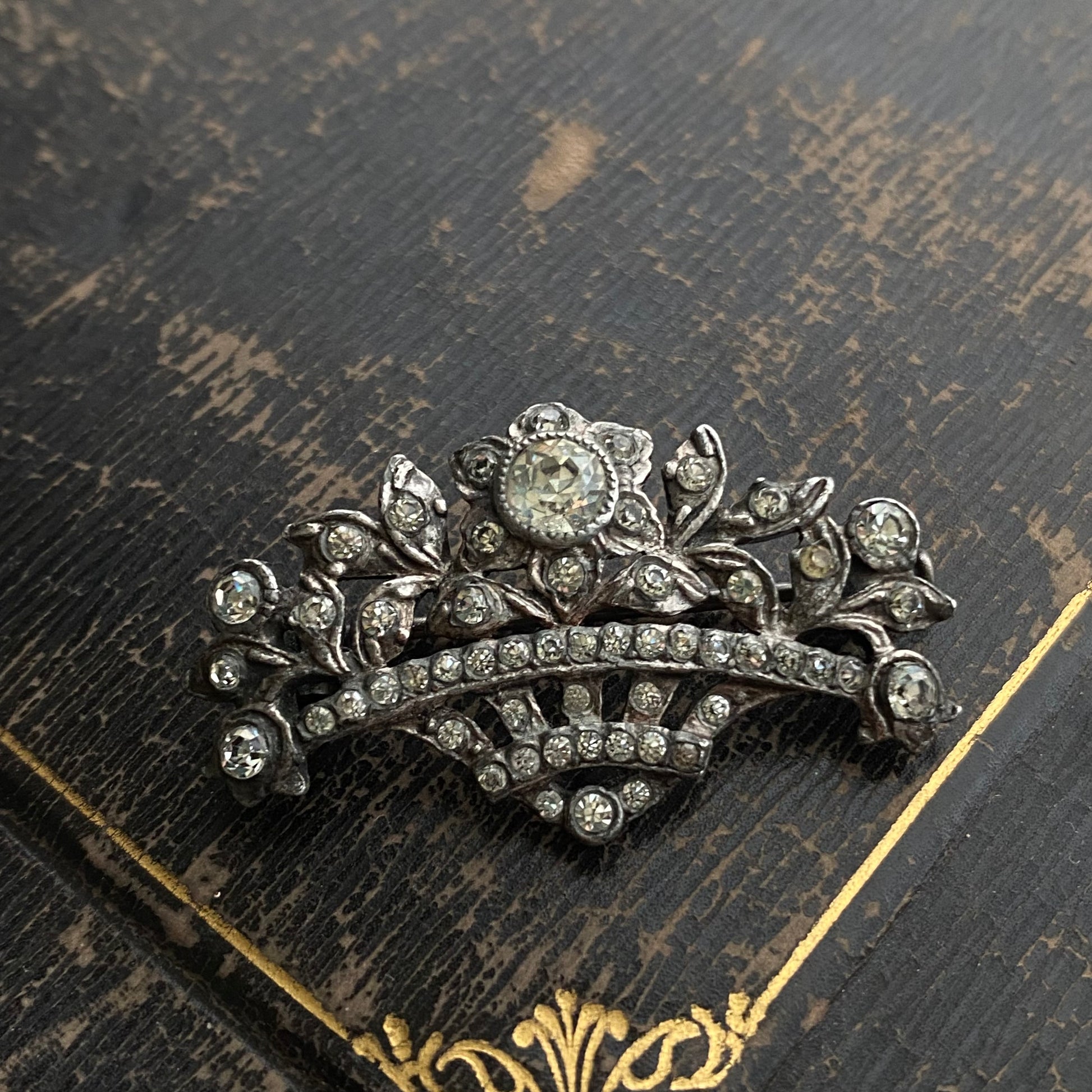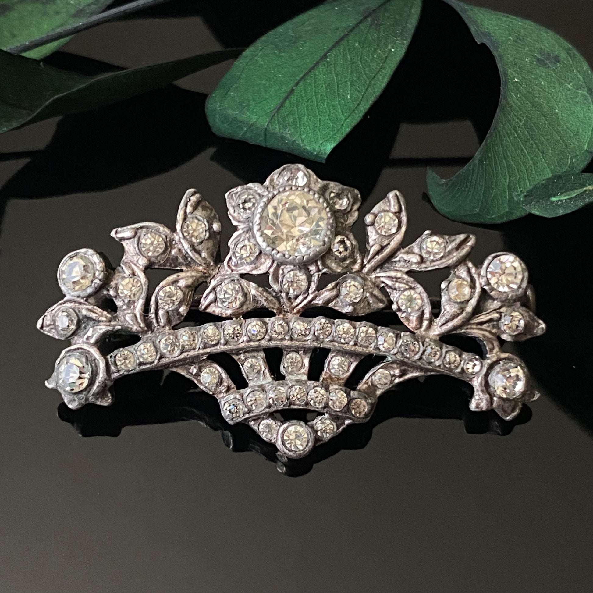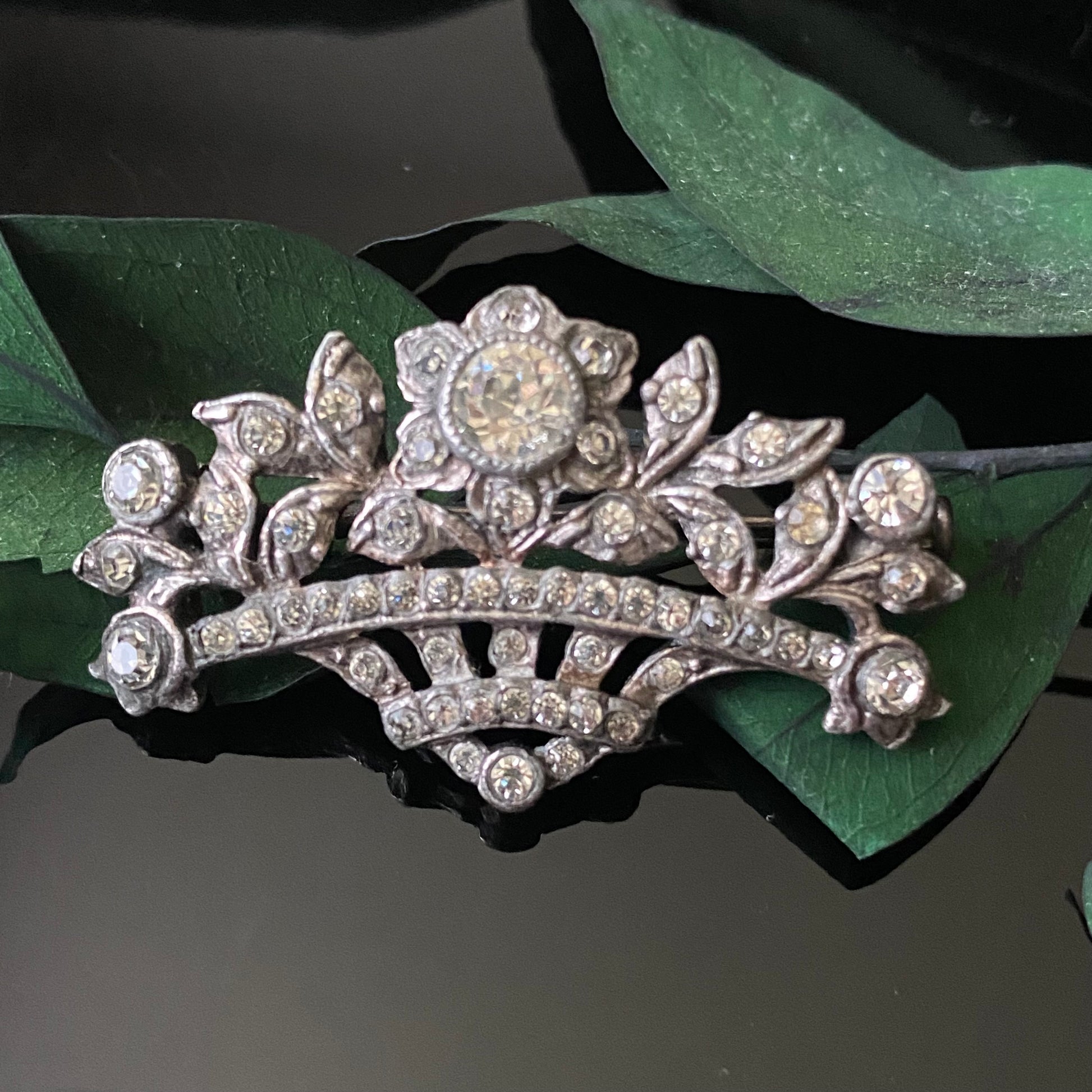 Antique Edwardian sterling silver and foiled paste “giardinetti” flower bouquet brooch with trombone clasp.