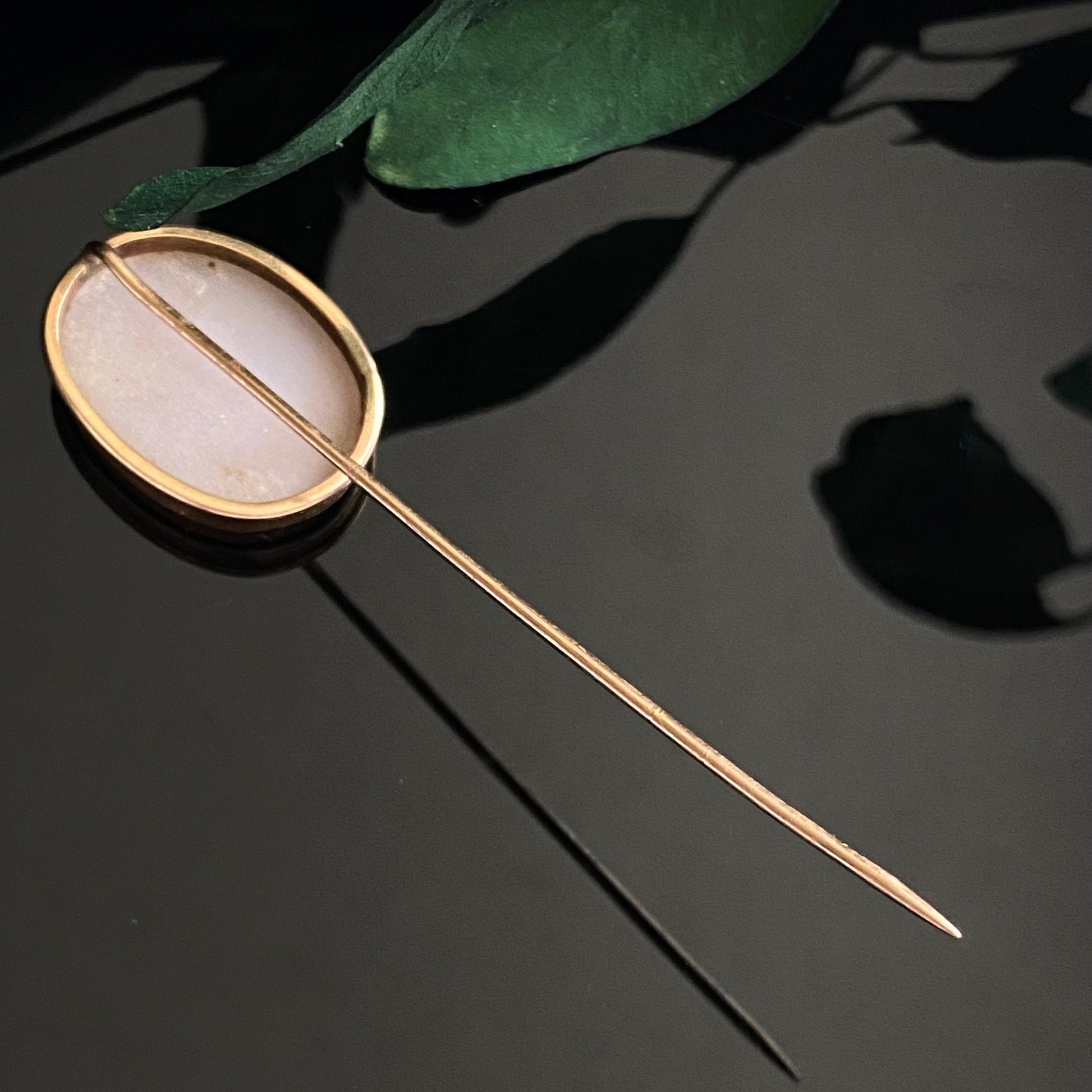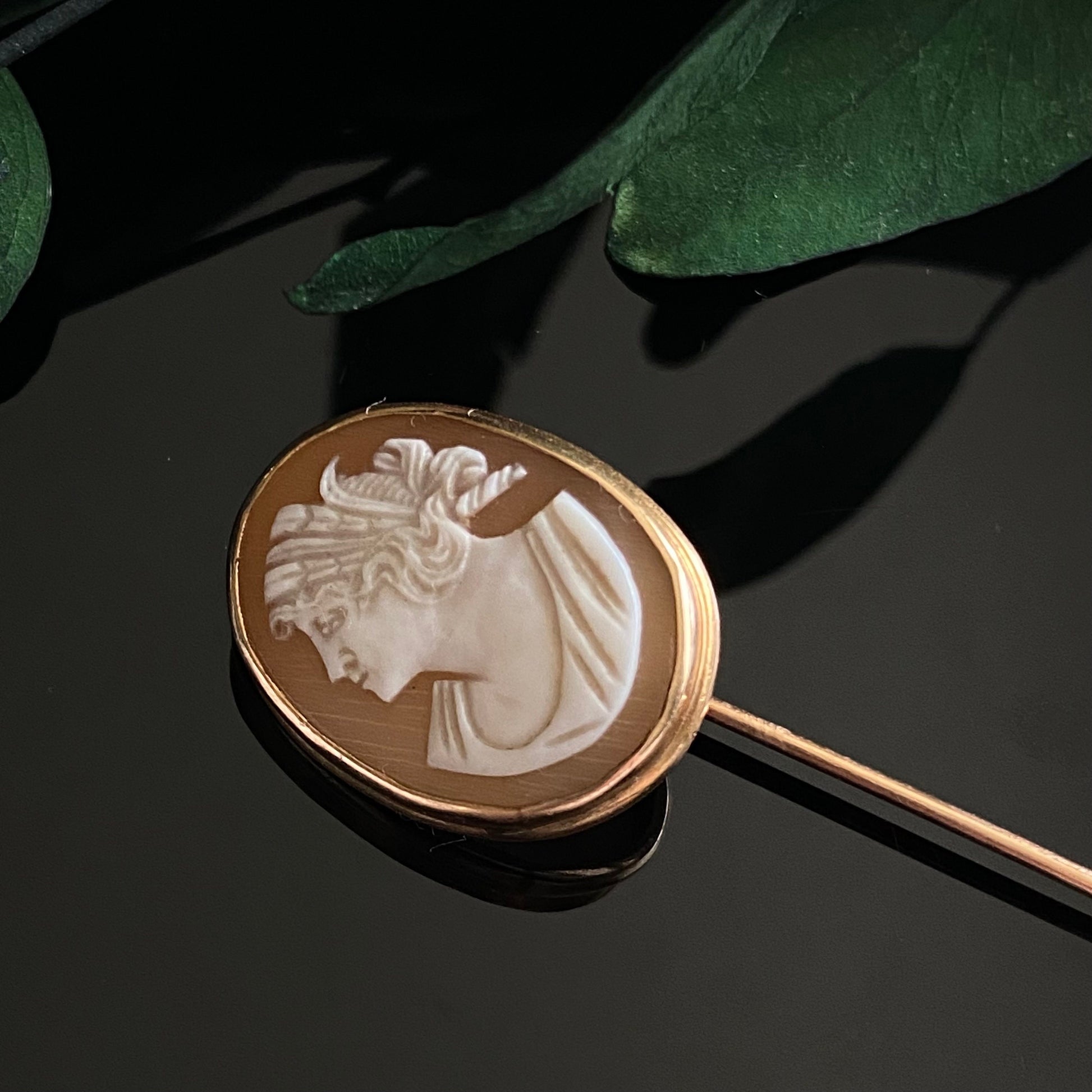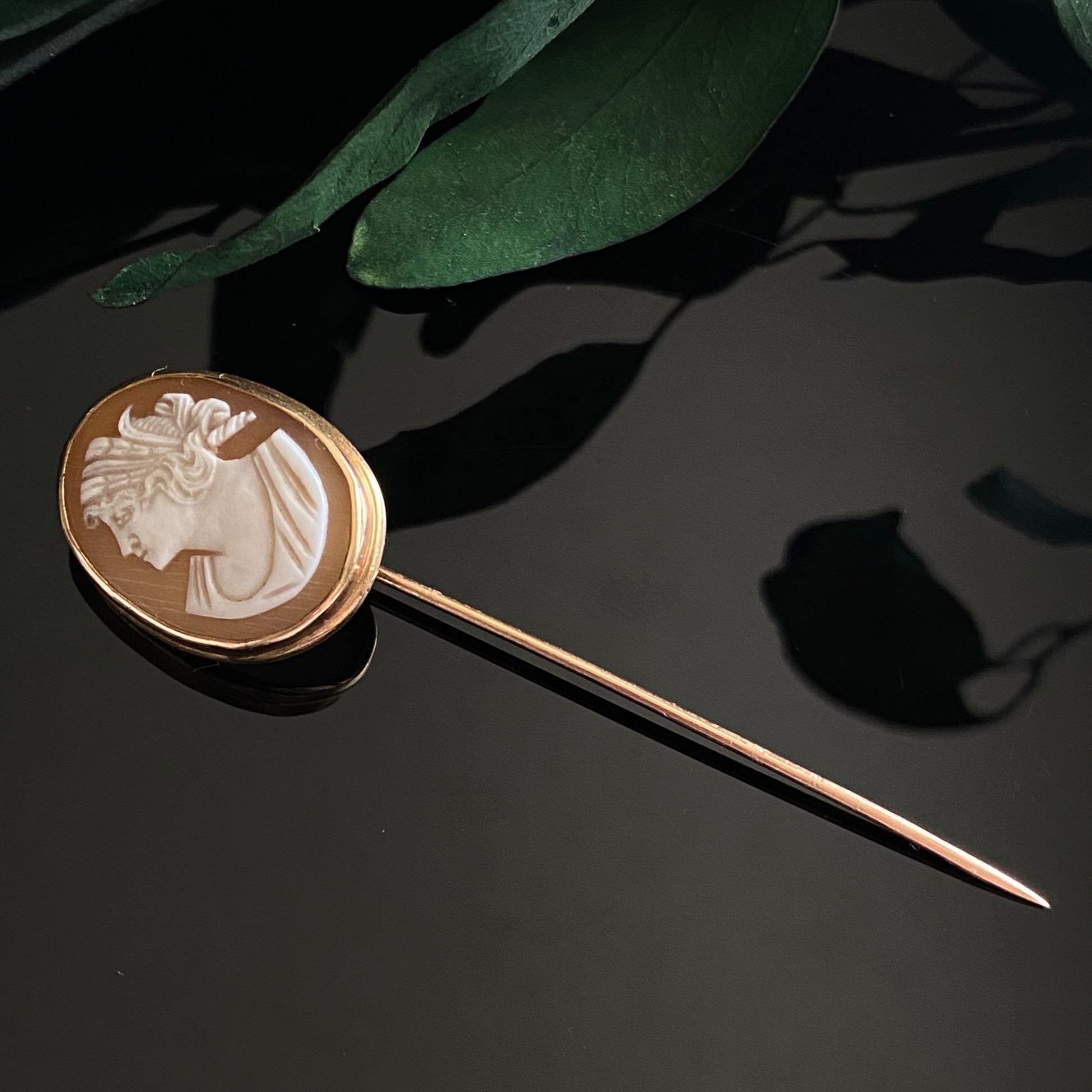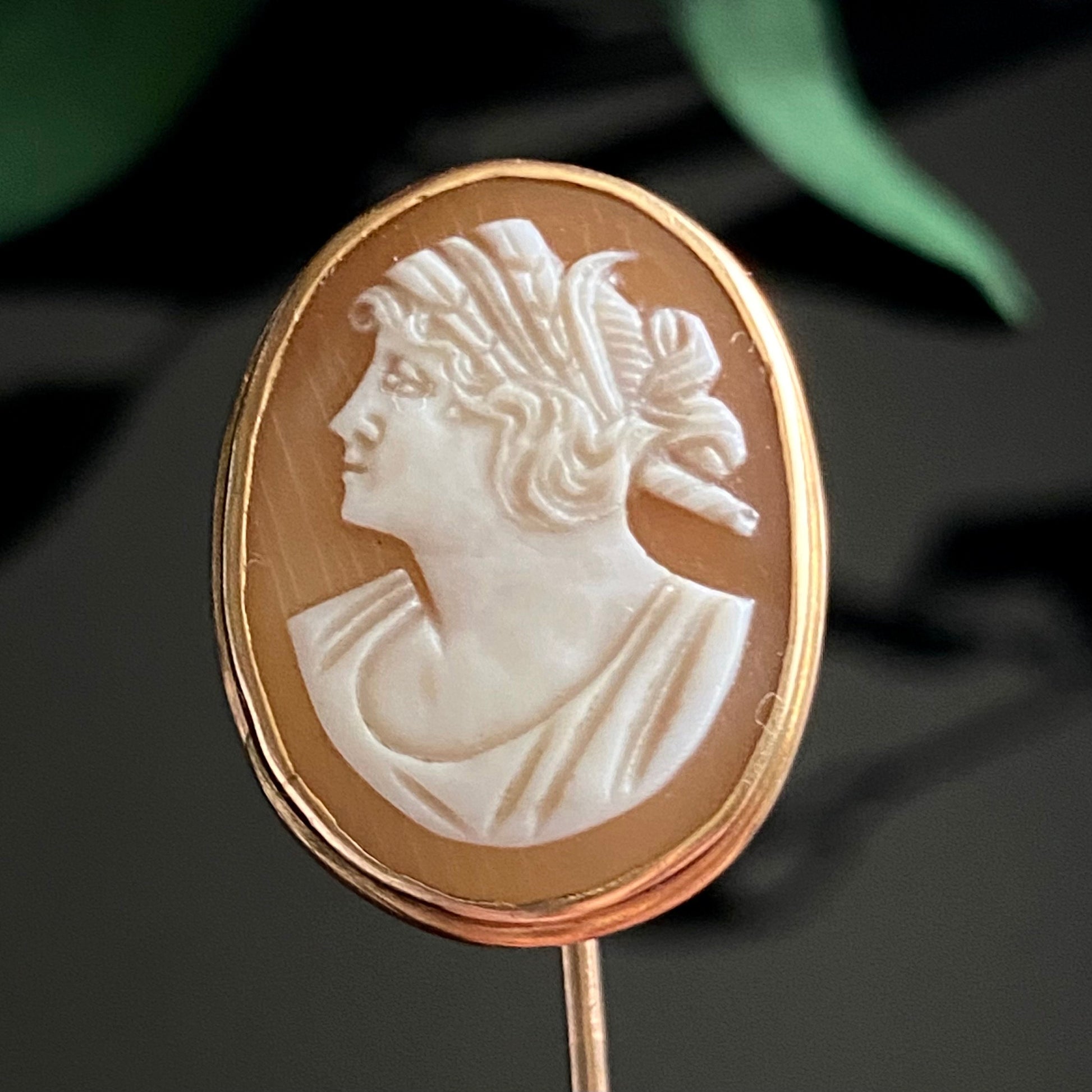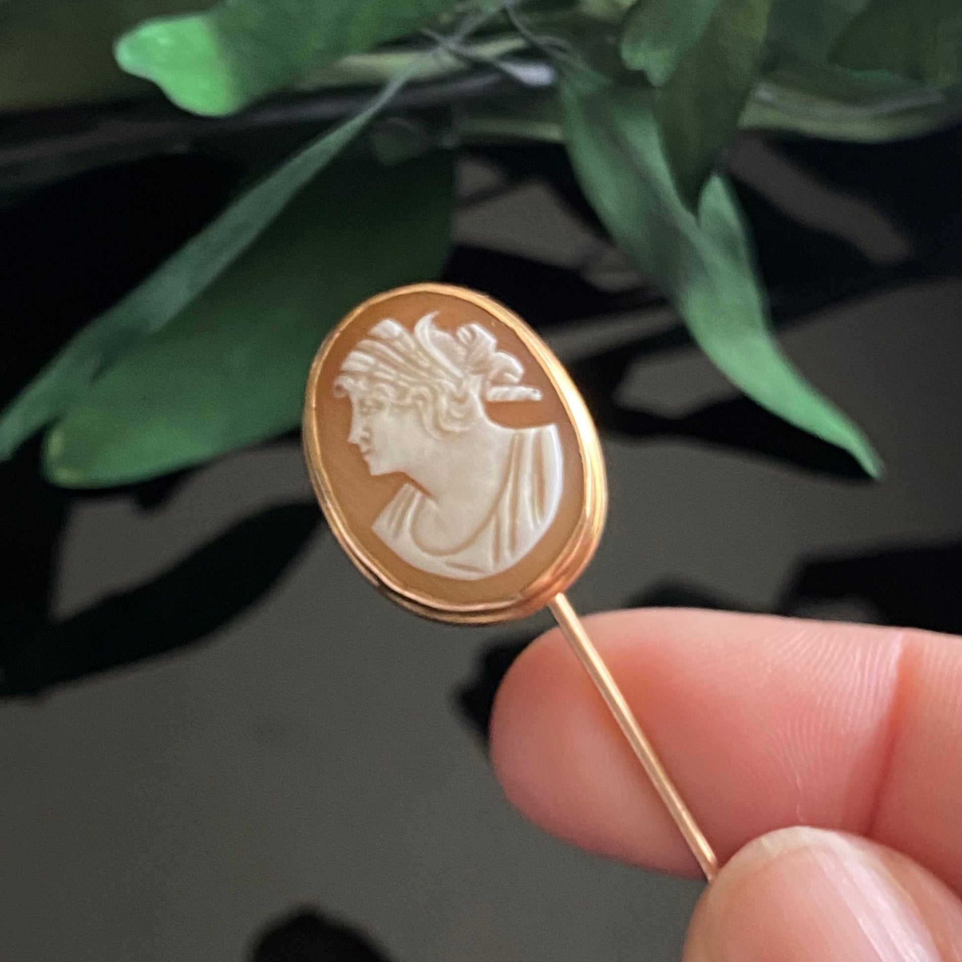Antique Victorian 10k gold agate cameo stickpin depicting Greek goddess Hera.