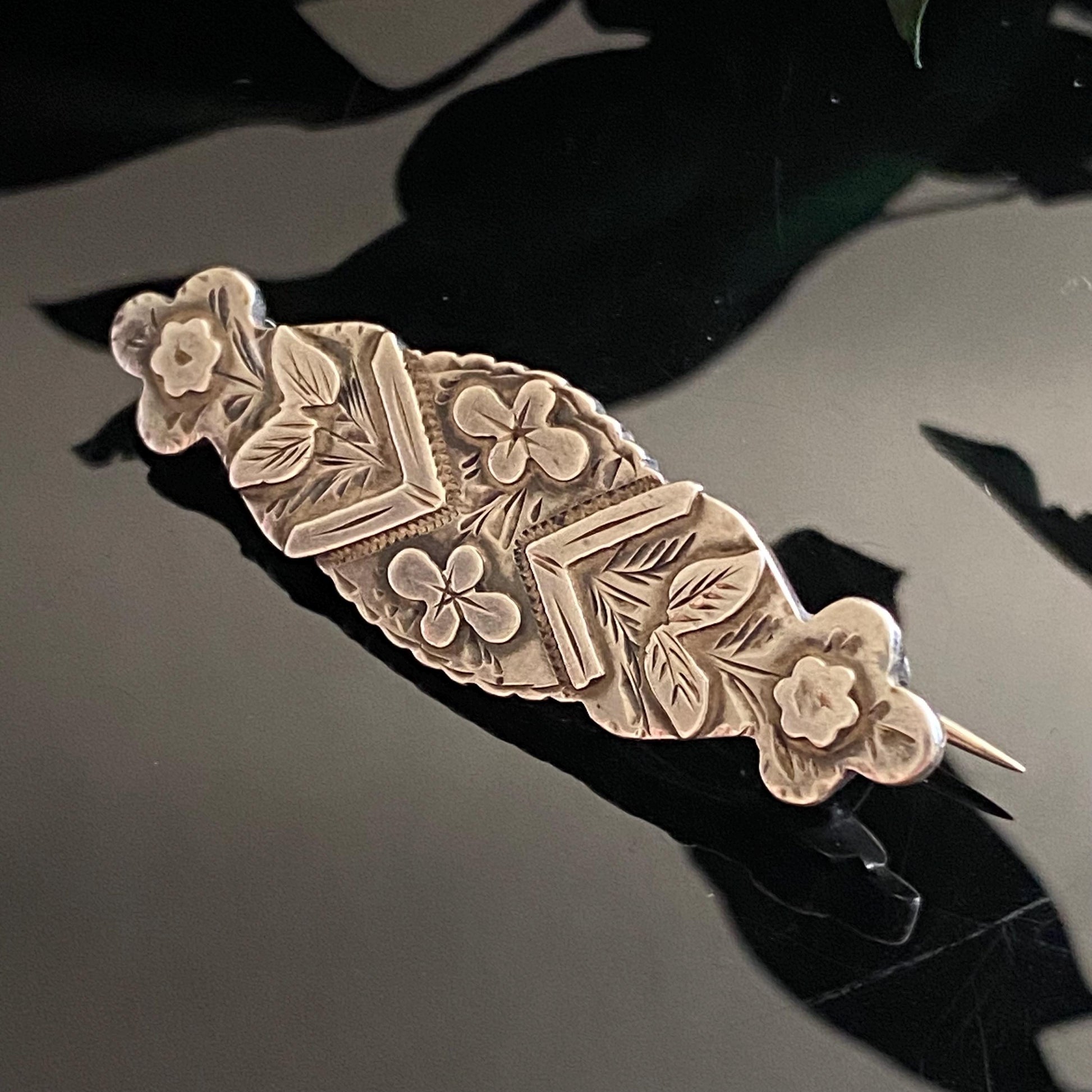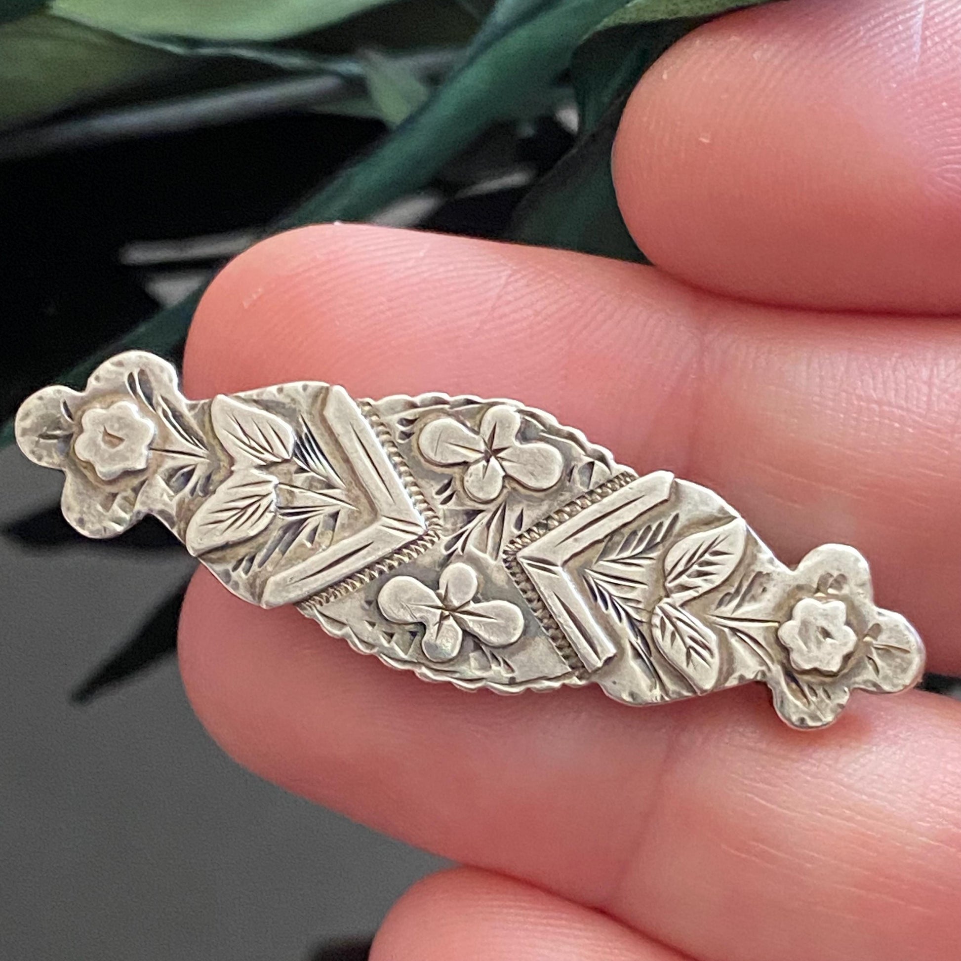 Antique Victorian English Embossed Floral Sterling Silver Bar Pin c. 1890 Chester
