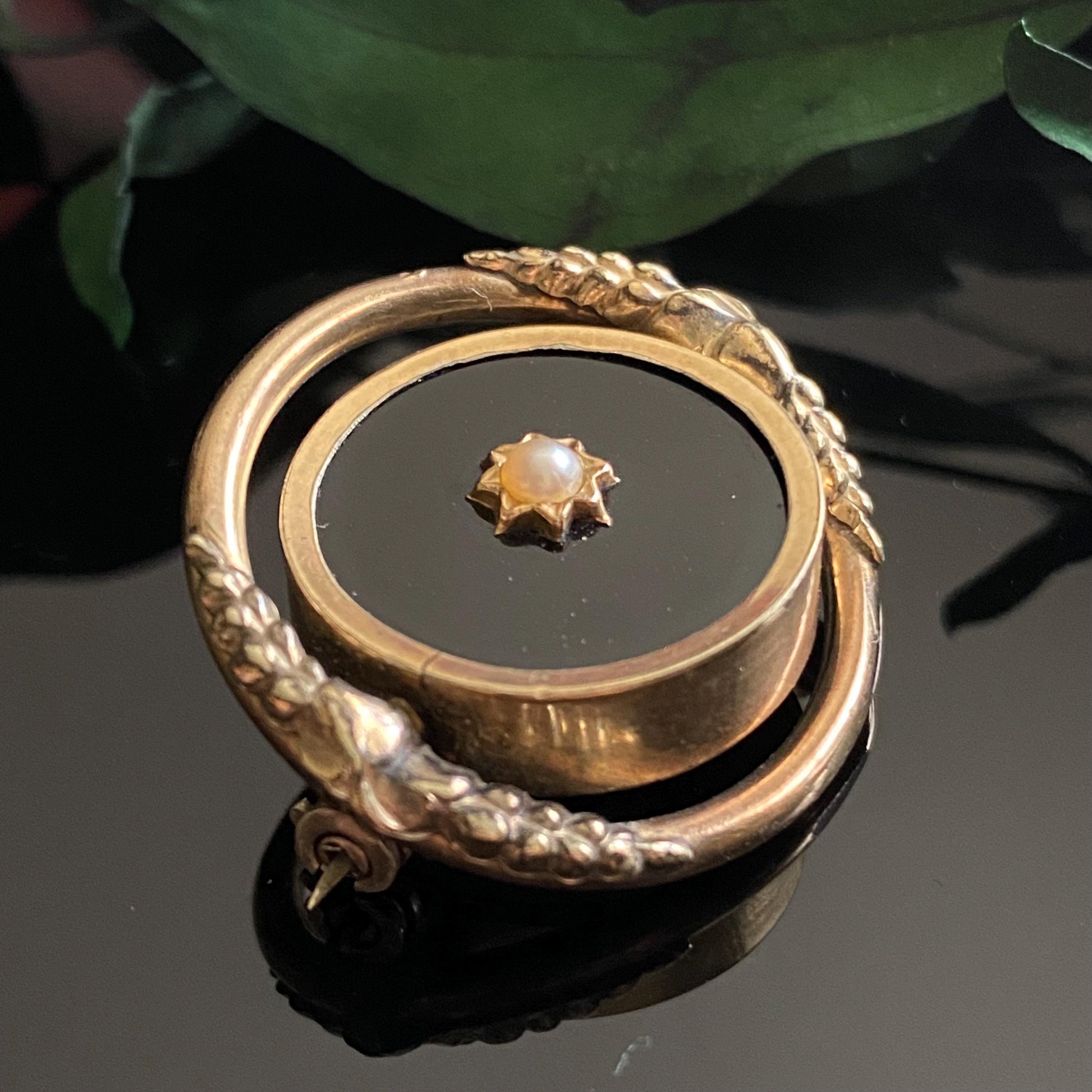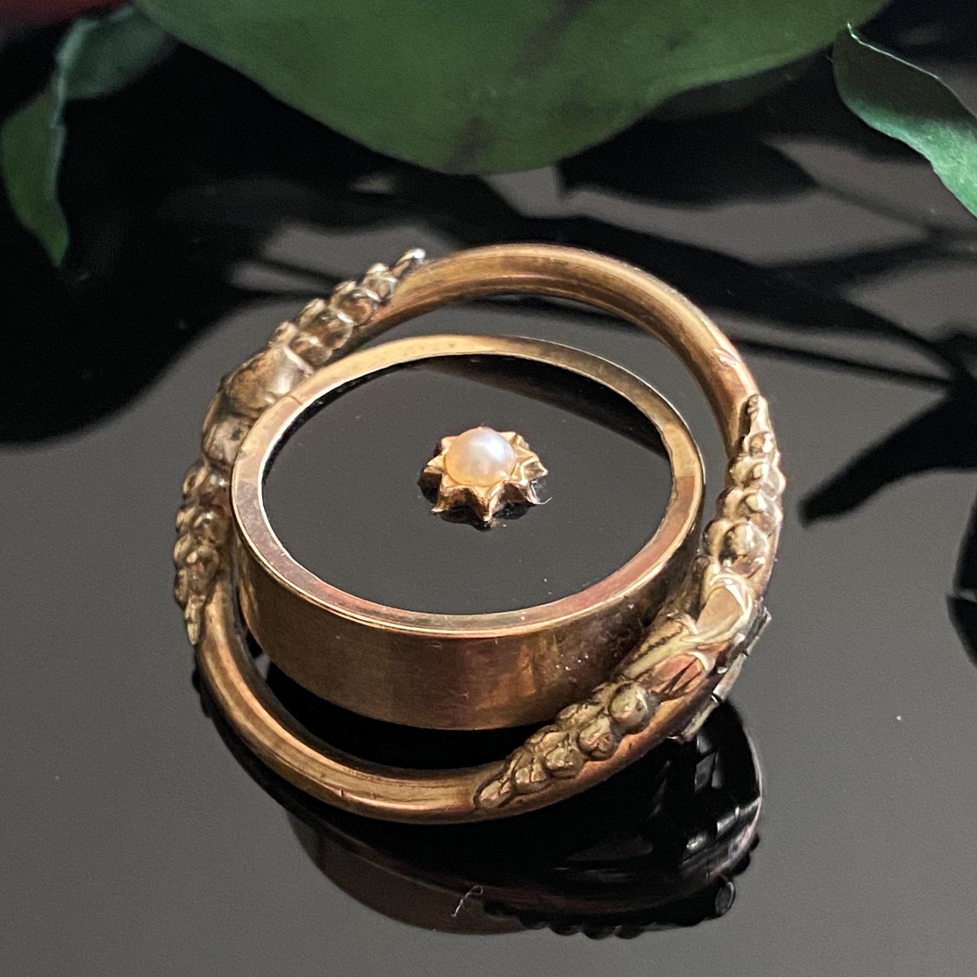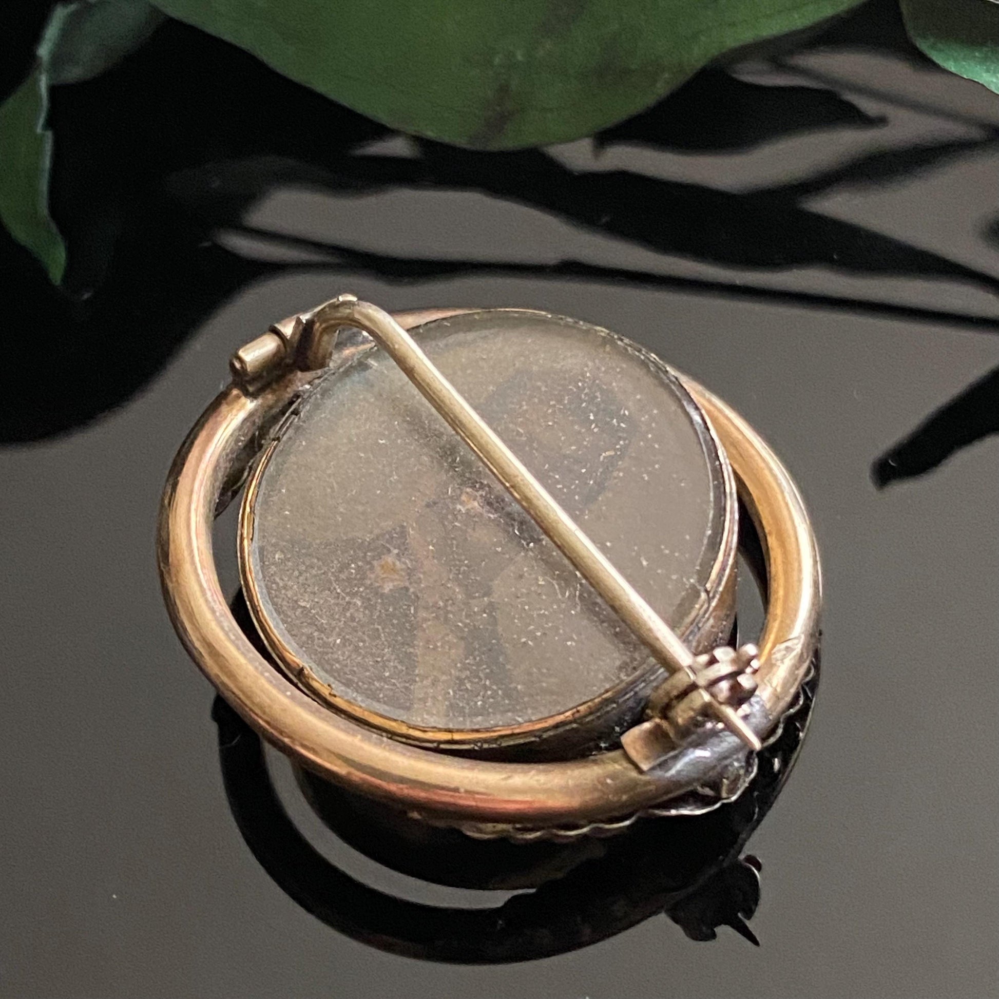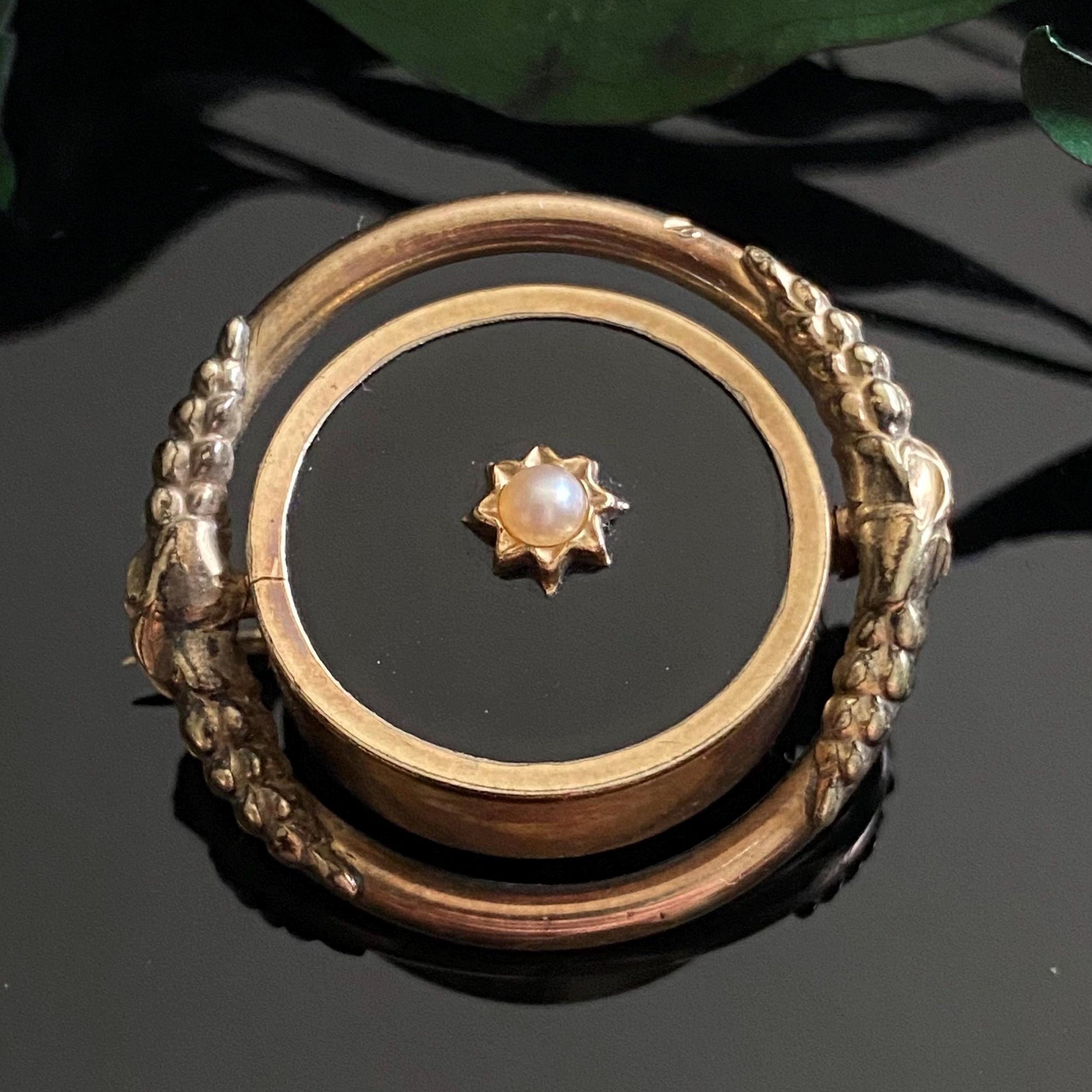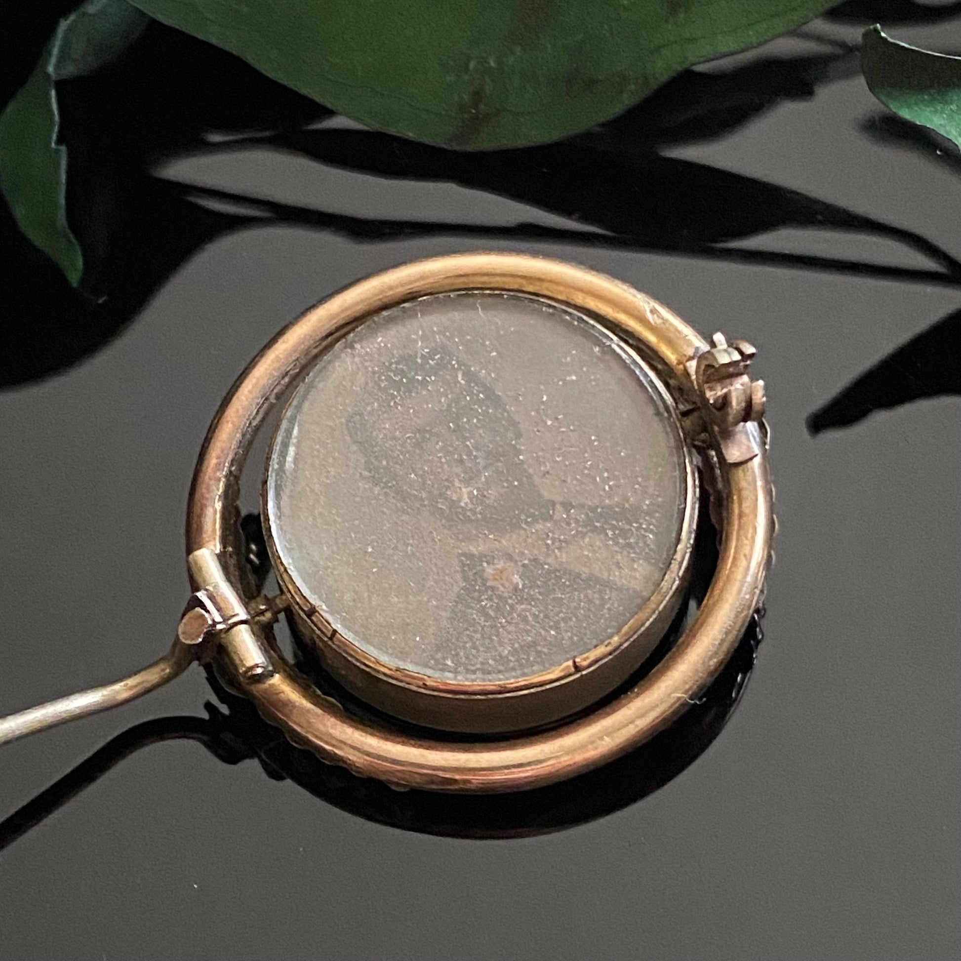 Antique Victorian era gold filled mourning swivel brooch. One side is “French jet” glass with a pearl center, while the other is an original photograph of a man with glass cover.