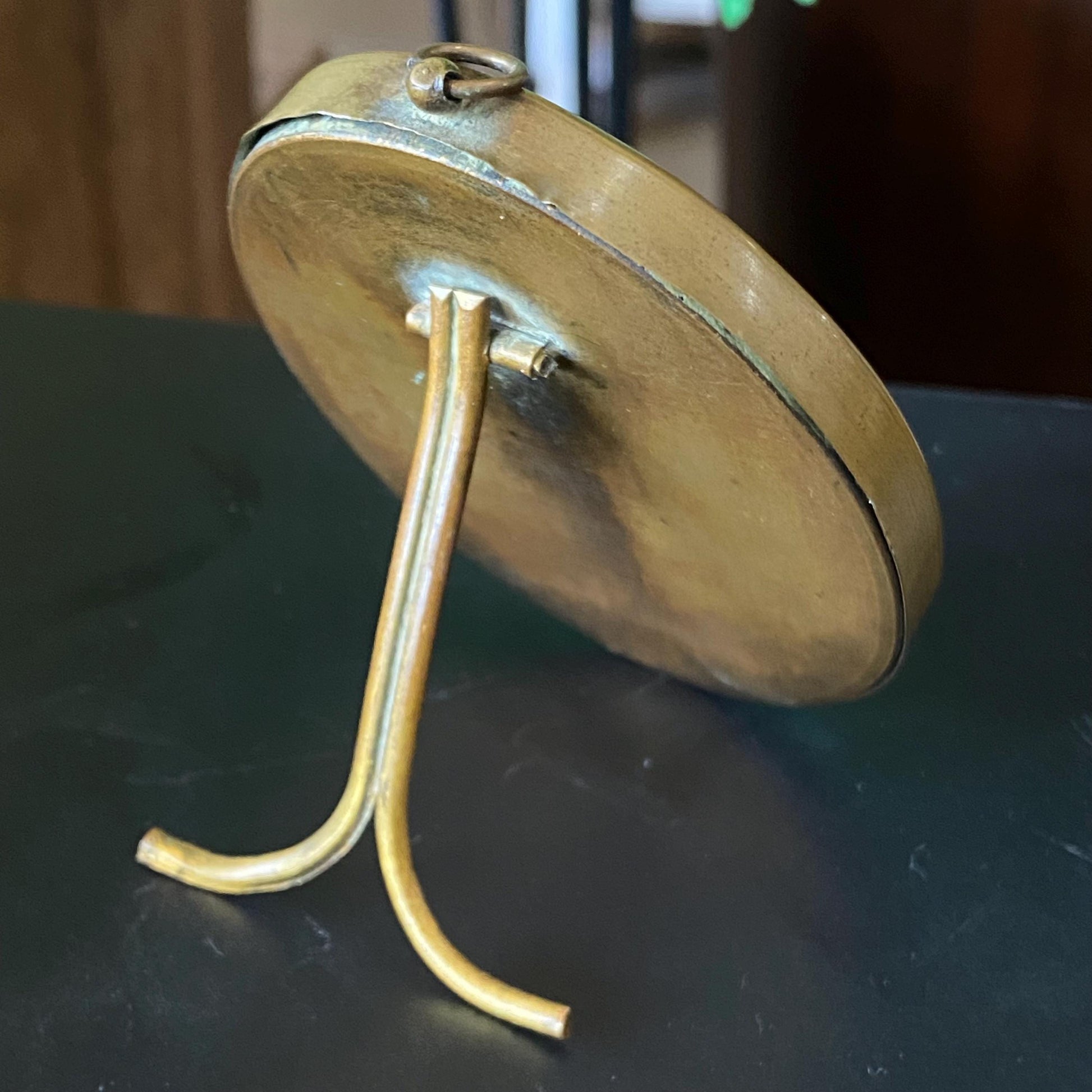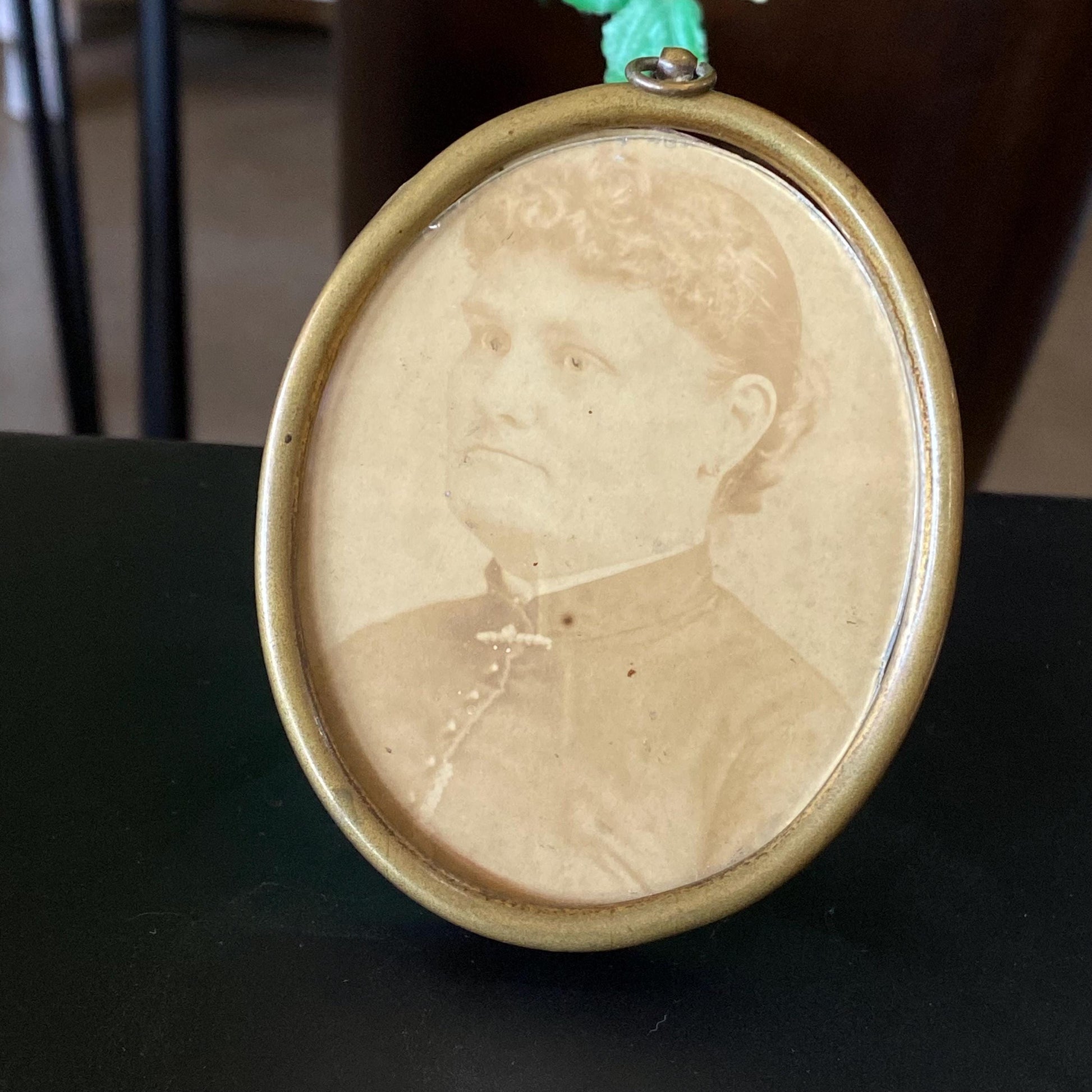 Victorian era photograph of a woman in a brass and glass picture frame. The frame can be hung on the wall or can stand on a shelf. Could use a polish but otherwise good condition. Measures 3.5” x 2.8”