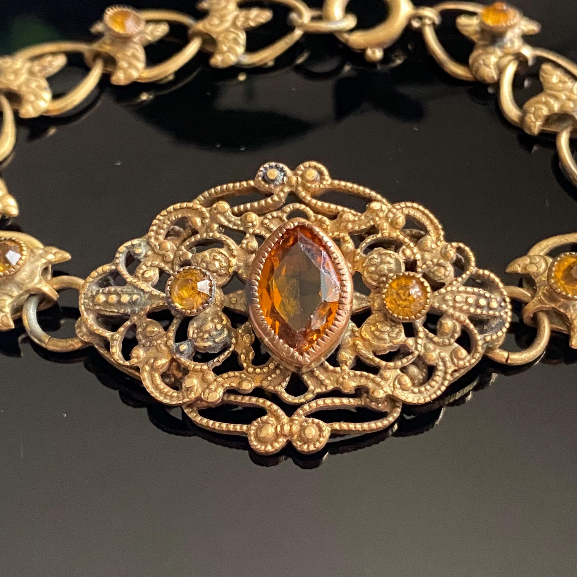 Antique or vintage art deco brass filigree bracelet with marquise cut and round orange Czech glass.