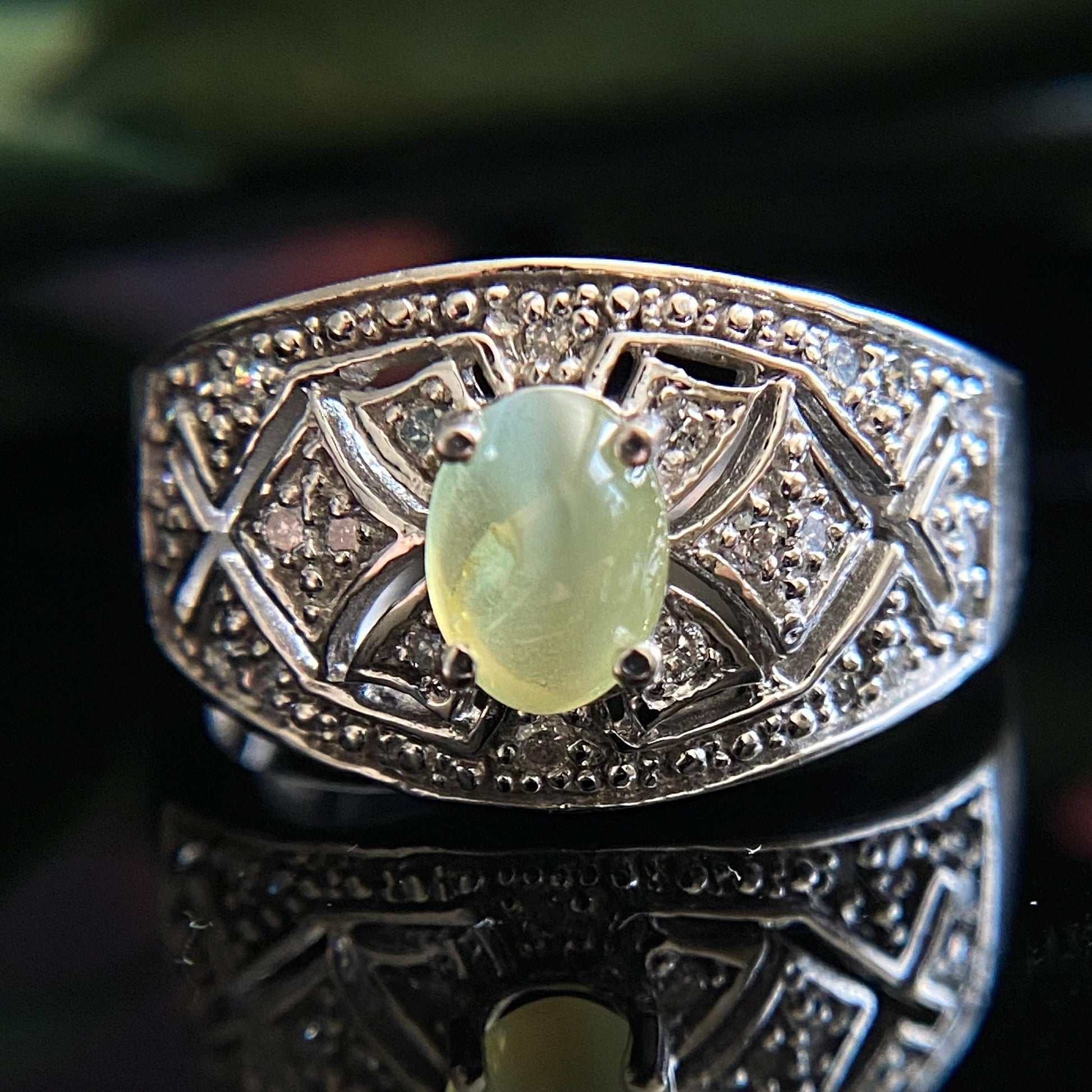 Estate 14 karat white gold cat's eye chrysoberyl and diamond accent ring.