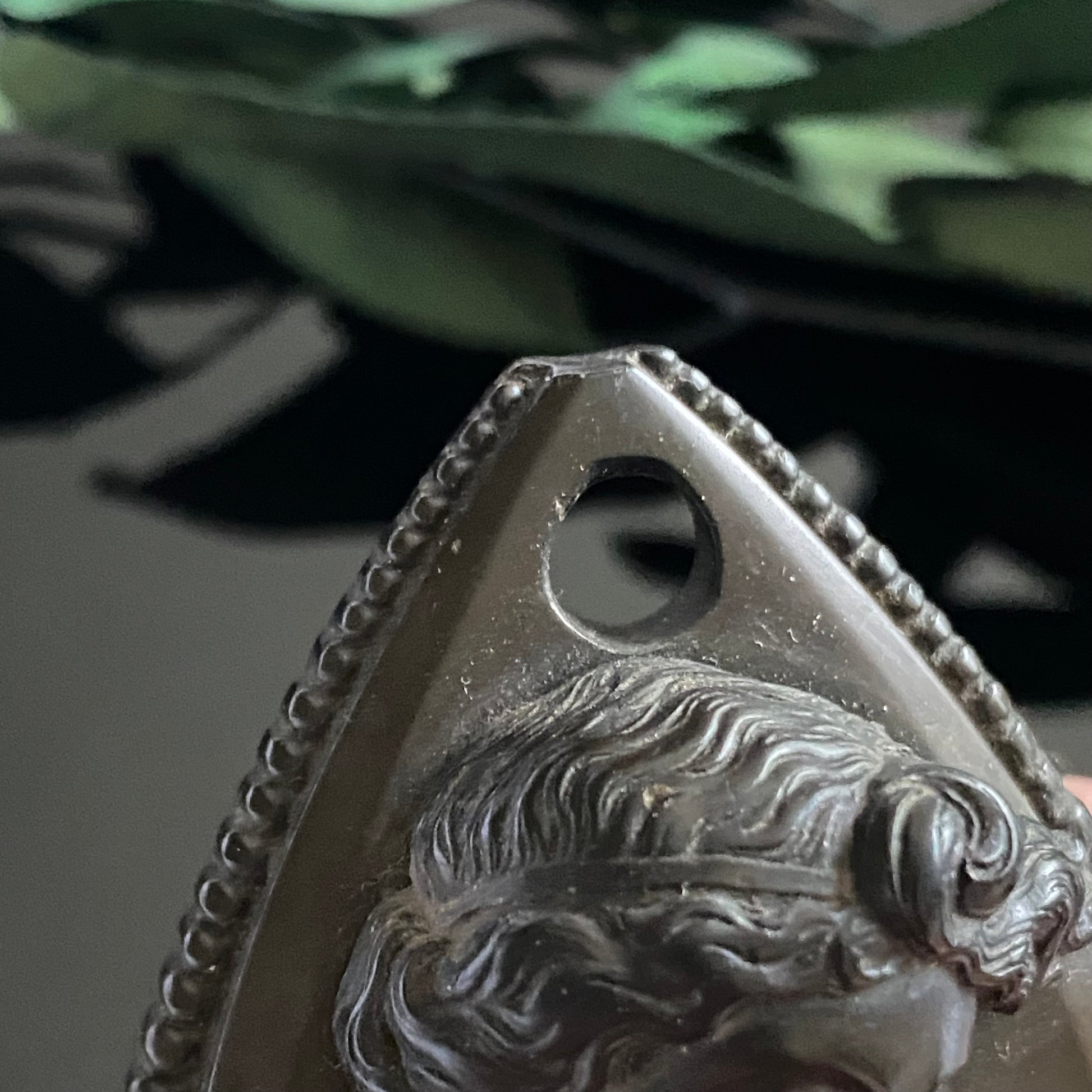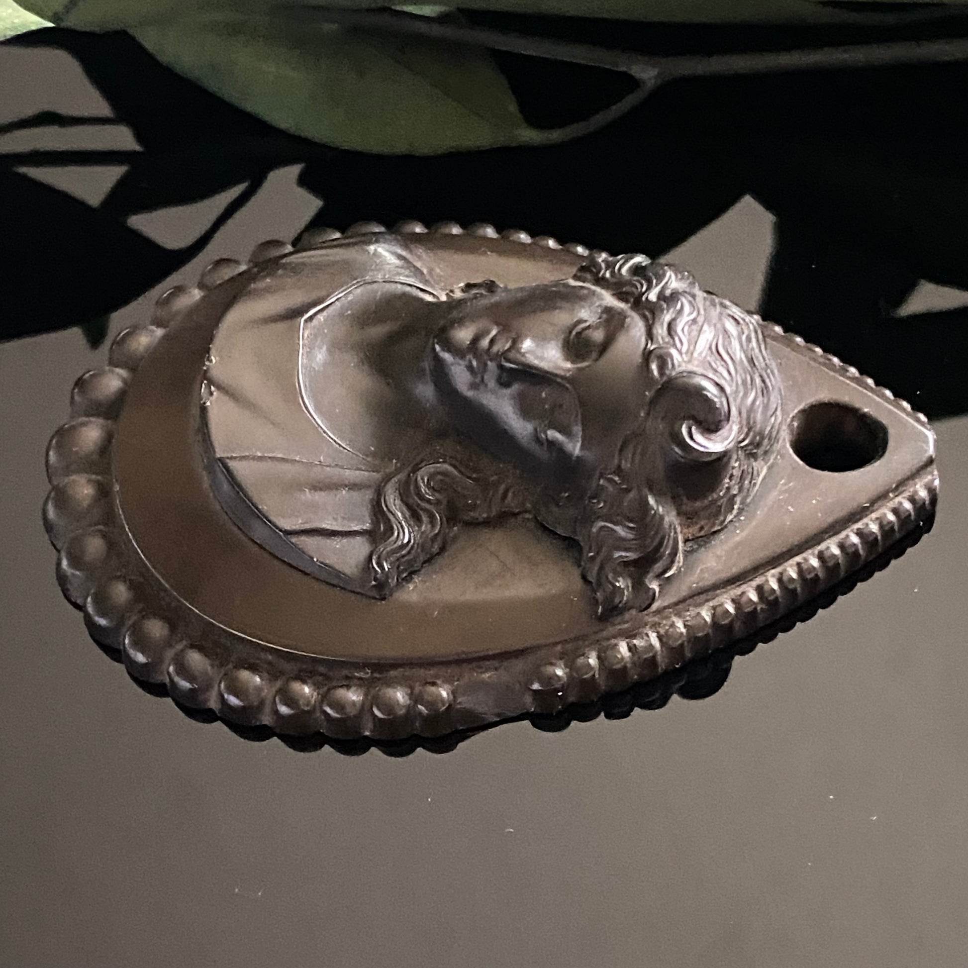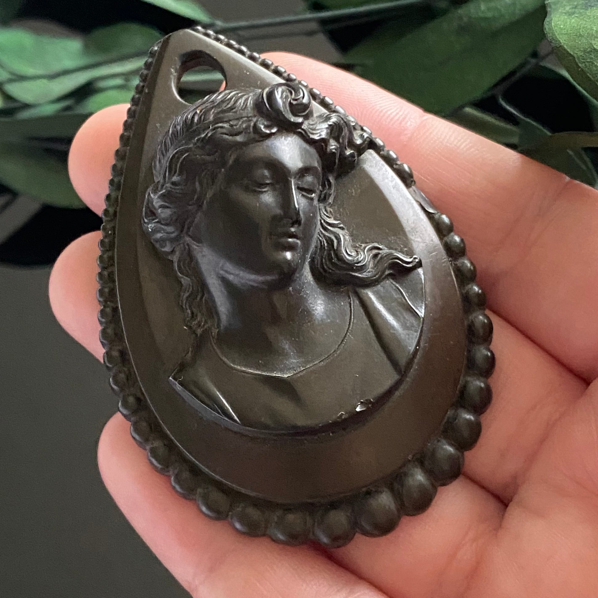 Antique Victorian era Gutta Percha high relief cameo pendant, likely worn during mourning.
