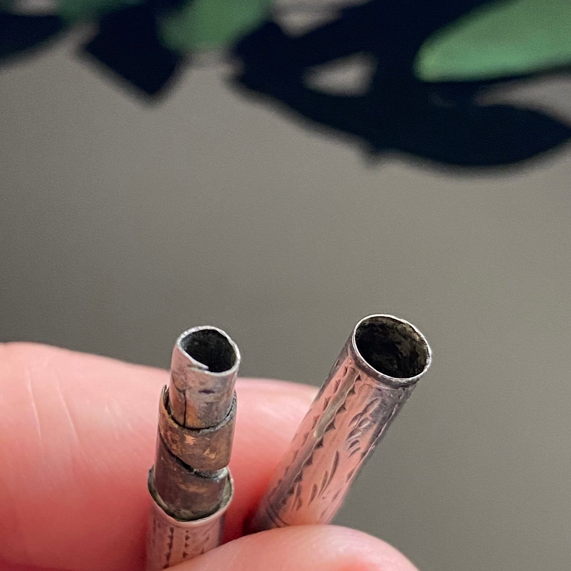 Good condition with typical signs of age and wear including some tarnish. The center where the two pieces connect is slightly crooked.