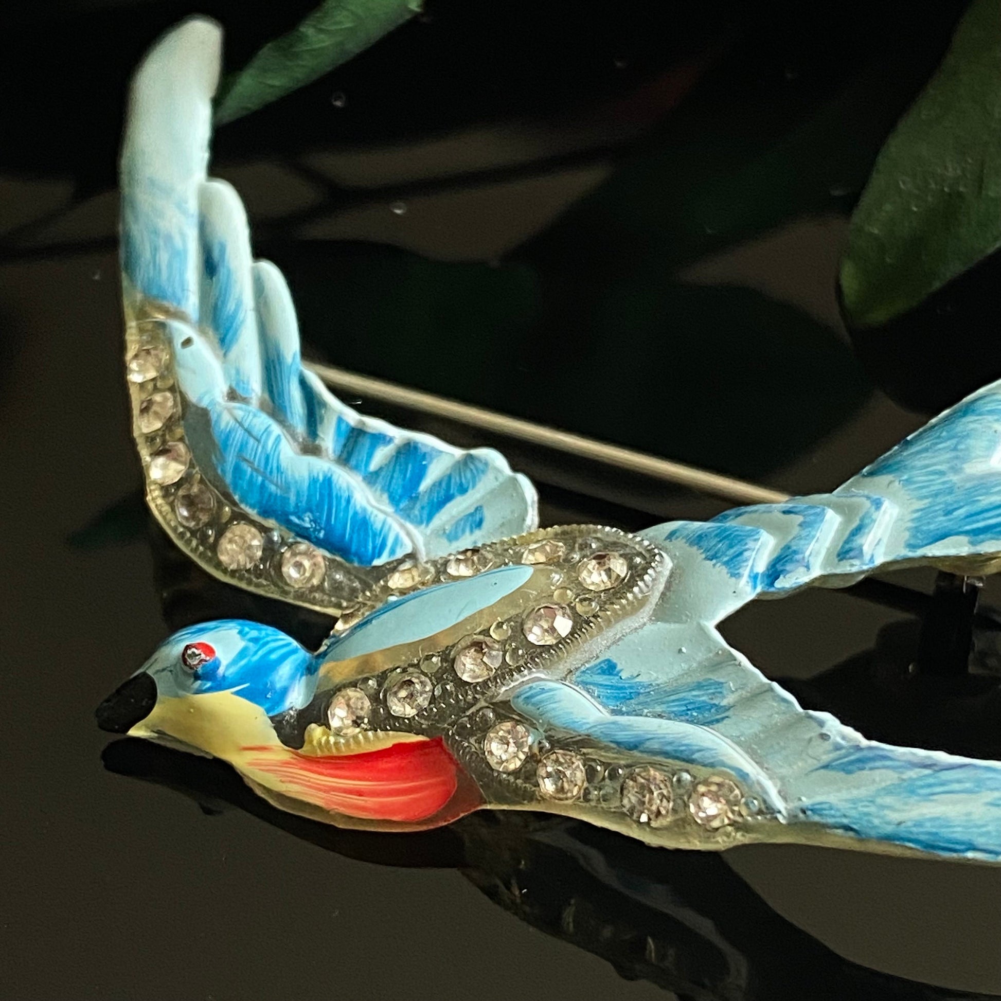 Vintage Celluloid Rhinestone Blue Bird Brooch