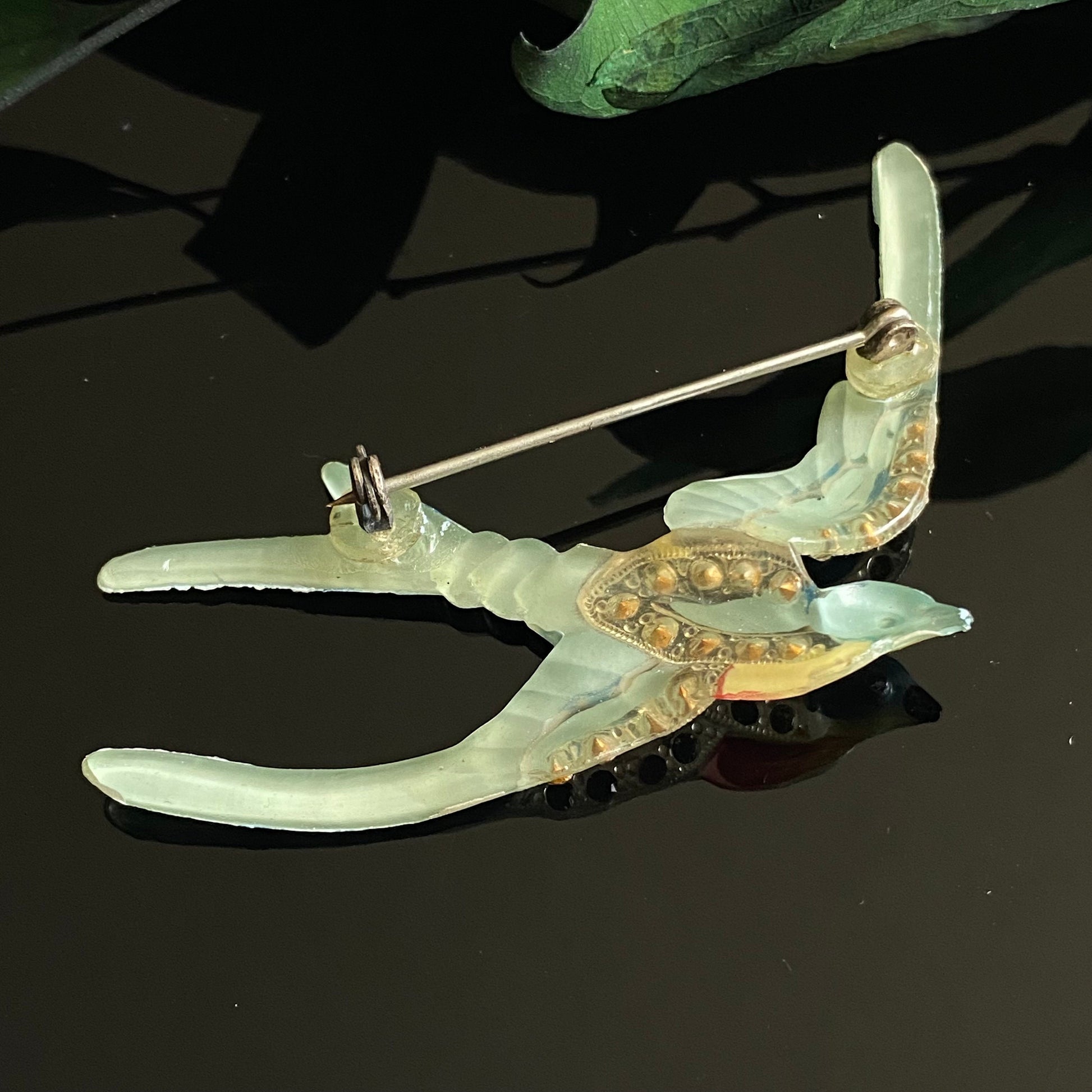 Vintage retro era celluloid and rhinestone blue bird brooch.