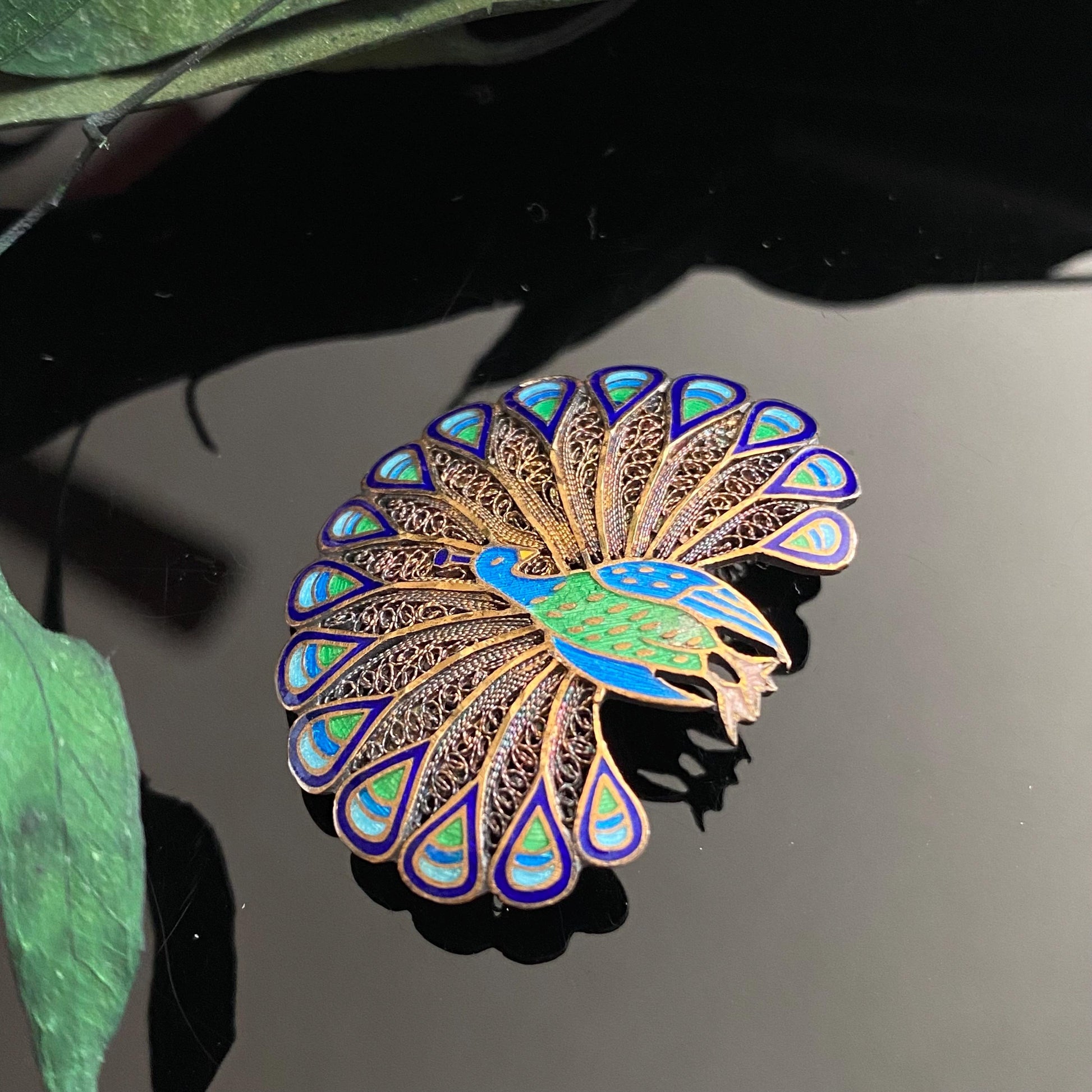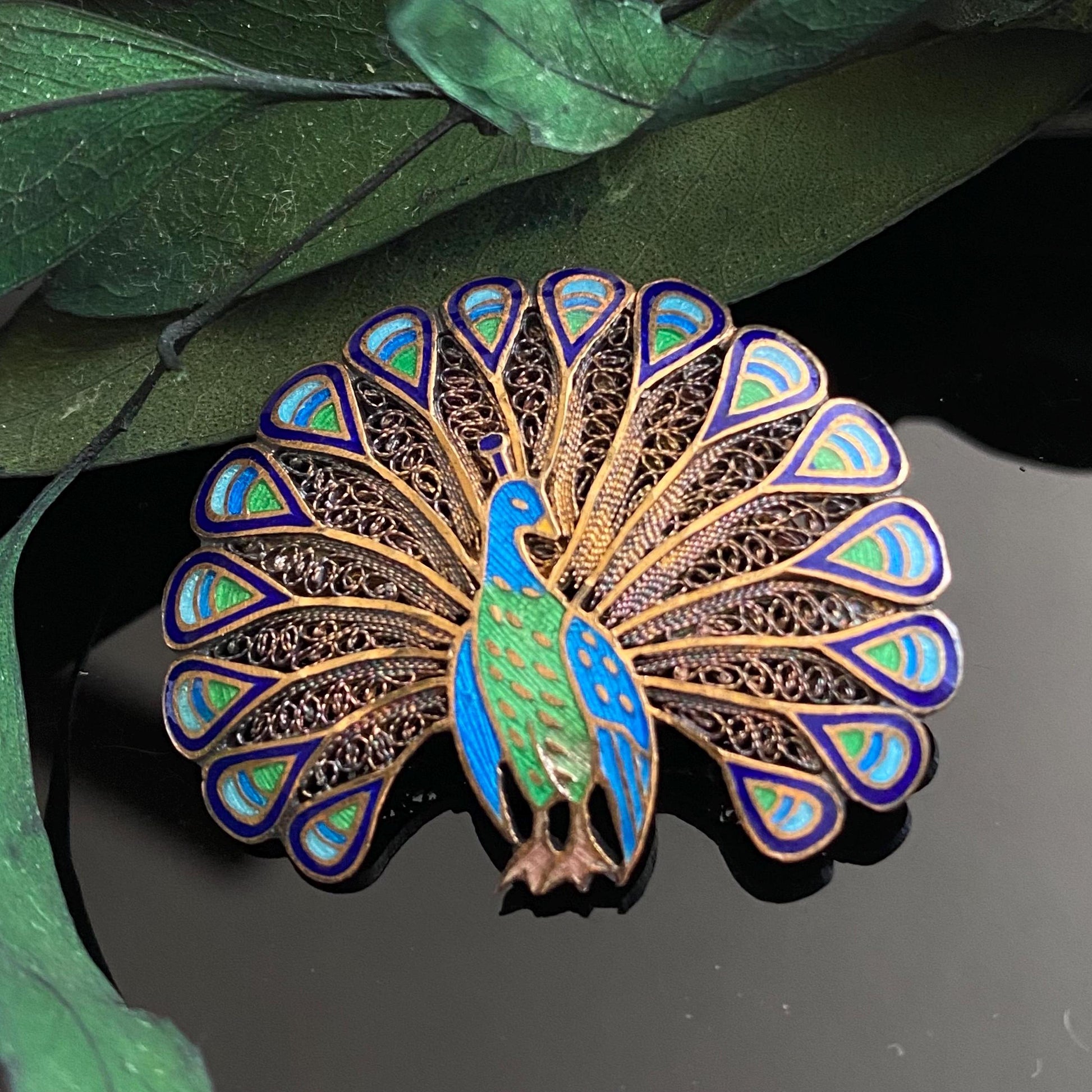 Vintage gilt 925 sterling silver and enamel peacock brooch.
